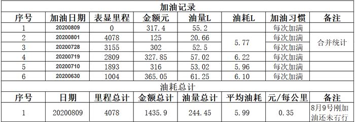 从6月30日至今,行驶总里程4078公里,总加油金额1435.9元,消耗燃油总量244.45升,总平均油耗5.99升/百公里,平均每公里燃油费用为0.35元,平均每天行驶100公里,总计购车时间40天。