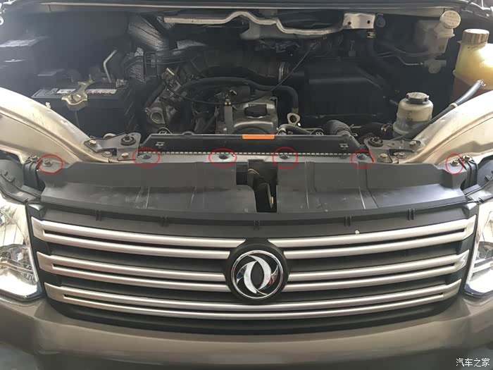 要拆前进气格栅,就要拆4个膨胀螺丝(用螺丝刀和铰刀)和2个六角金属螺丝(10mm套筒和棘轮扳手),位置红圈内已经标识。
