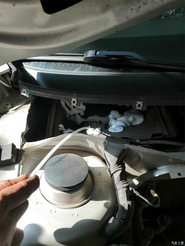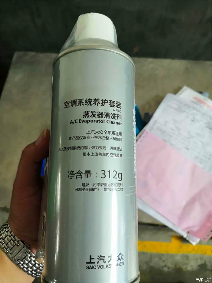 稍等片刻,继续把还剩半瓶的清洗剂喷进蒸发器,期间空调一直开到最高档。