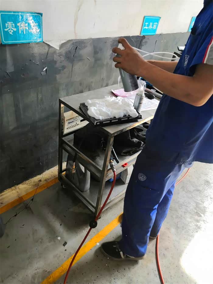 接下来小徒弟用胶管连接蒸发器清洗剂喷嘴,朝空调滤芯位置往蒸发器上喷清洗剂。
