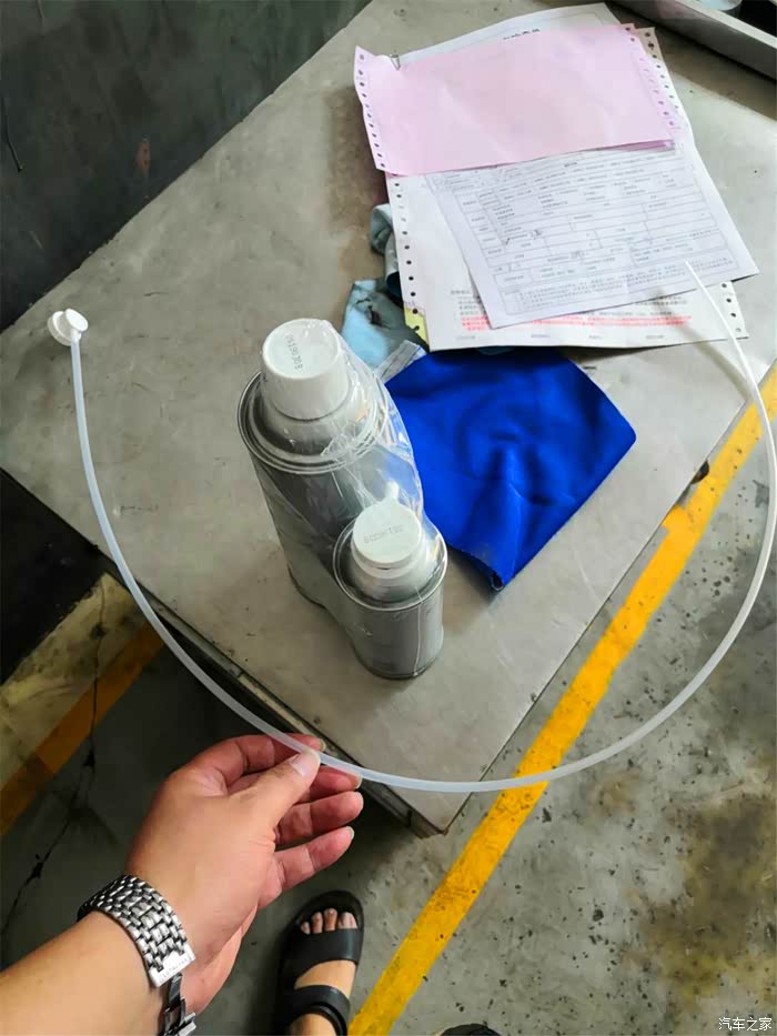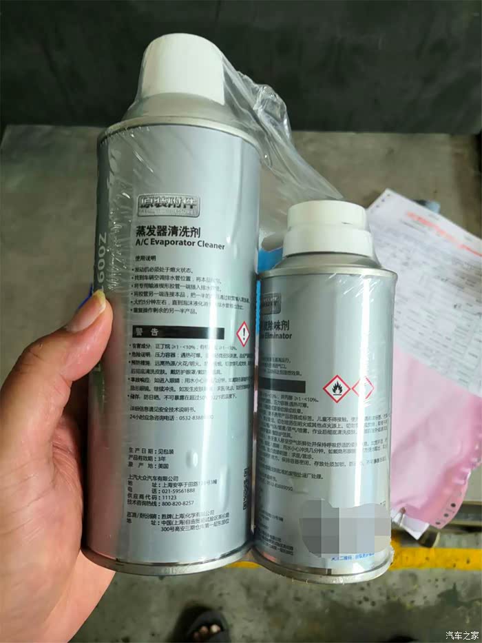 在这家4S店,我们所说的清洗空调其实就是清洗空调蒸发器,这就是这次清洗所要用到的产品:一罐是蒸发器清洗剂,一罐是空调系统除味剂外加一根胶管。