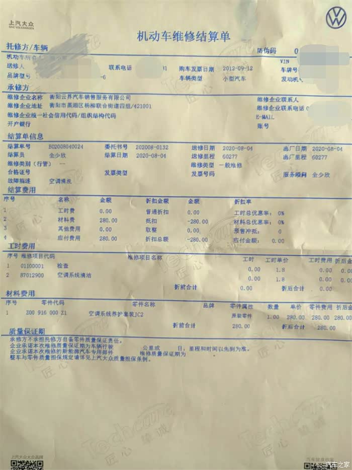 本次消费合计:320元,其中材料费280元,工时费40元,但因为老客户结账时支付280元。