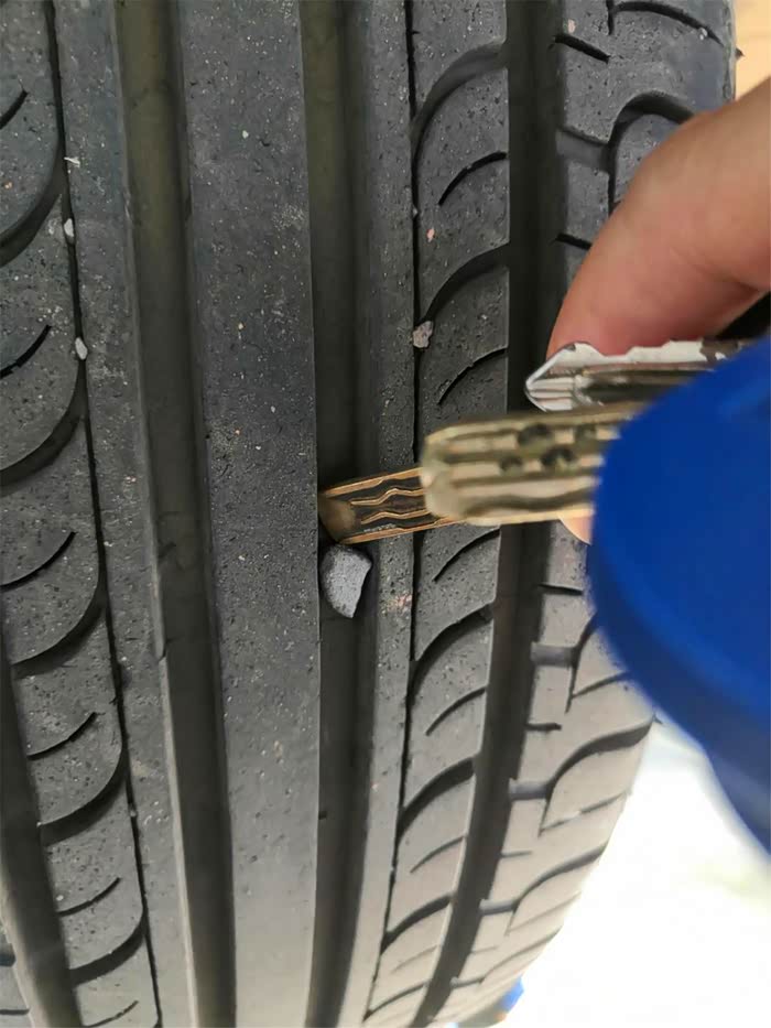 我也用钥匙把卡在轮胎纹理中的小石子清理掉。