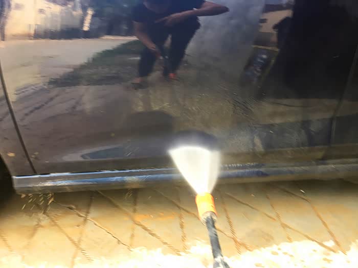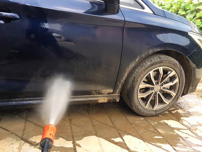 冲洗车身的时候,从上往下冲洗,不要用手去触摸枪头喷射的水,压力大容易受伤