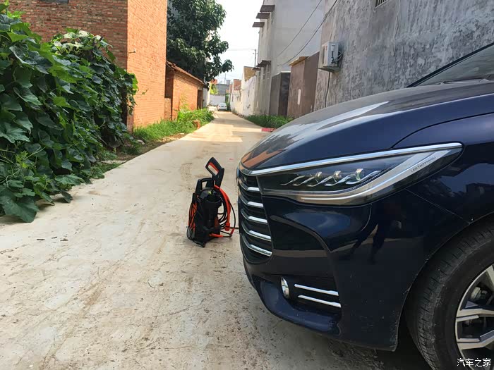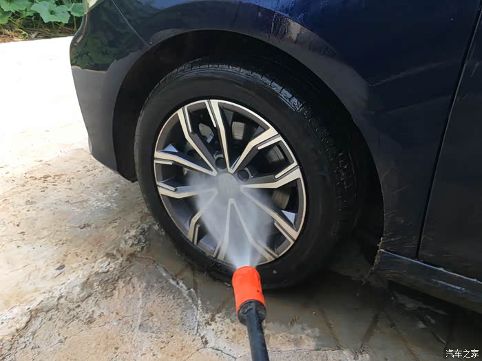 接下来连接好洗车机,在家洗车最好的原因就是地方特大,倒着洗躺着洗都可以
