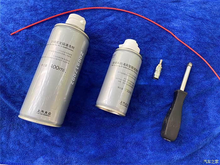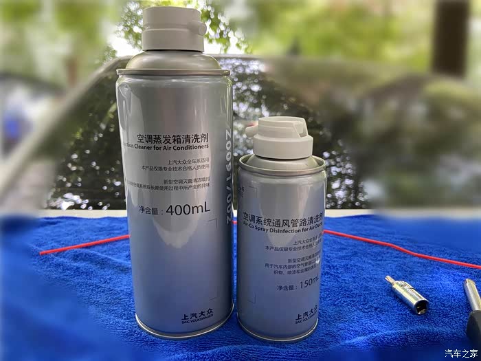 关于空调清洗剂,之前在网上有搜索过,各大商城好评如潮差评泛滥,让我一时不知所措,心想究竟是买回来试一下还是咋地。正好最近看到论坛上有车友在4S售后清洗空调,问了车友群里的都说不错,只是费用上有些贵而已。都说有钱难买健康,后来咨询了售后服务顾问,最终决定还是购买售后里面的空调清洗套装。说实话店里的工时费确实不便宜,加上自己喜欢折腾,所以爱车的空调系统清洗作业自然交给我自己完成啦。从售后购买的空调清洗套装包括了通风管路清洗剂(150ml)和空调蒸发箱清洗剂(400ml),原装附件的质量我还是比较信得过的,有了这个空调清洗套装接下来就开搞吧。
