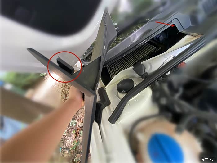 滤芯安装好之后,再安装上面的盖板。注意红圈的卡子和箭头。