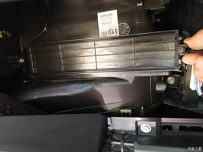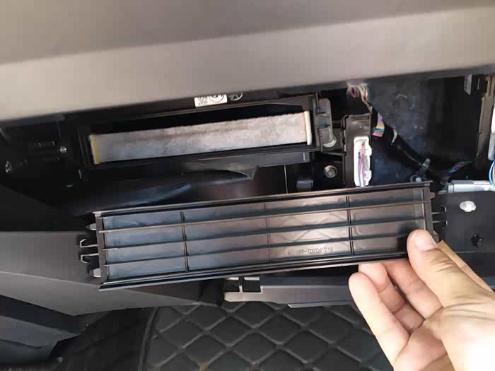 开搞!空调滤芯在手套箱里面,要取出手套箱,按箭头方向稍微用点用挤压就可以取下来了。汽车说明书上也有详细介绍,比较简单了。