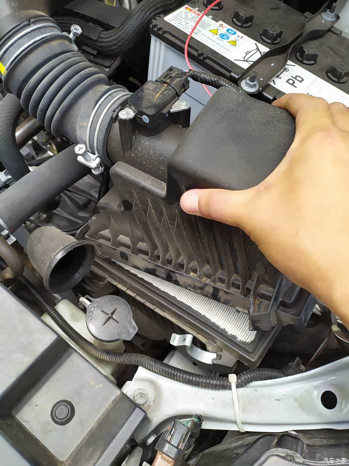 空气滤芯就更好换了,打开发动机舱,找到这里,两个卡子掰开。