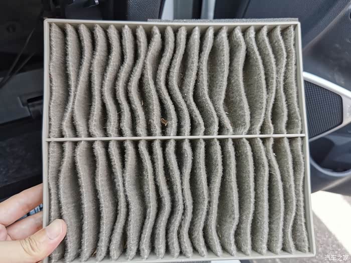 这空调滤芯费了九牛二虎的力气总算是拆下来了,里面的灰尘不是一般的少,整个滤芯的颜色都变了。