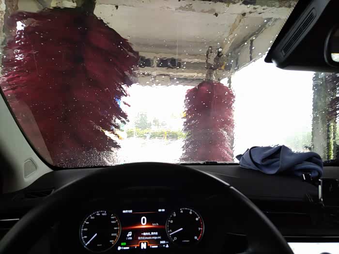 进入自动洗车机前,有个告示牌,提示你要注意哪些事项。当时在车内忙着操作忘记拍照了。主要的几点就是,不要熄火,挂N档,不要拉手刹,不要踩脚刹,关闭车窗,不要开雨刮器等。按照要求一通操作,先开到轨道上,然后挂N档,松开脚刹、手刹。