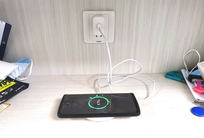 找到电源插头,插电连接,放上手机准备充电,手机刚放在充电器上,反应很灵敏,瞬间开始充电,个人感觉这个充电器特别适合车载使用,连接车载电源,固定无线充电器,开车时手机放在上面就可以充电,来电话时拿起即可,当然了开车禁止接打电话,只是省去插线连接时不小心缠绕在哪里而发生危险。
