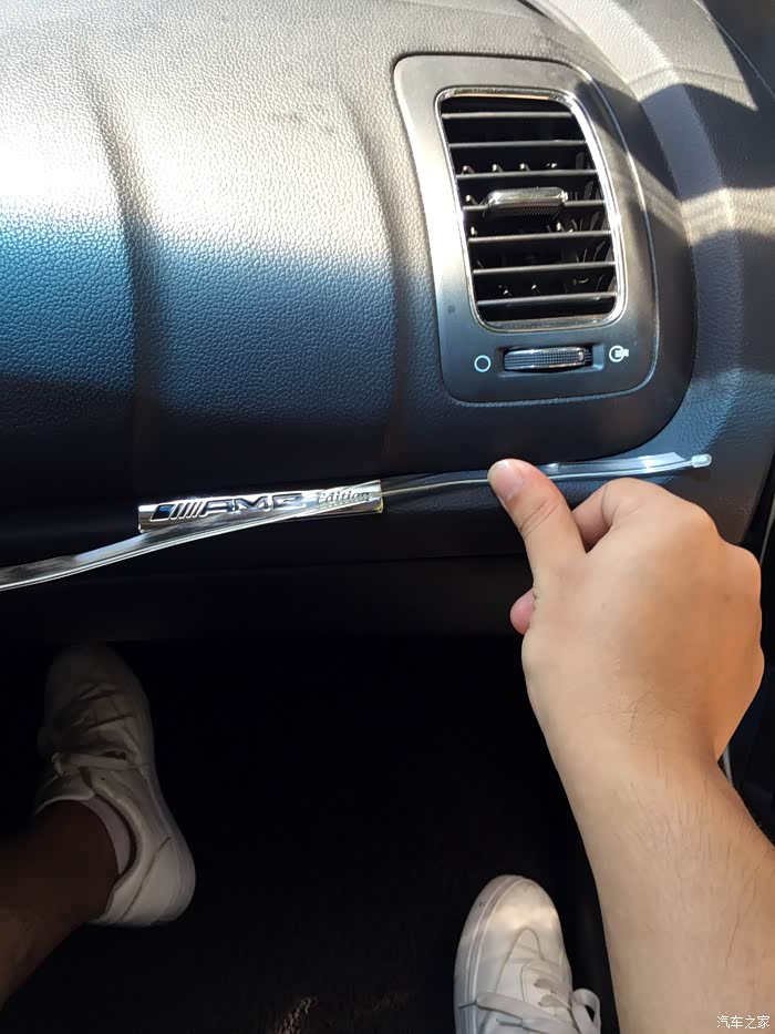 网上好多车友是放这里的,可以一直走到方向盘位置。但是这不就挡住了我的AMG标了吗,不好,换个地方。
