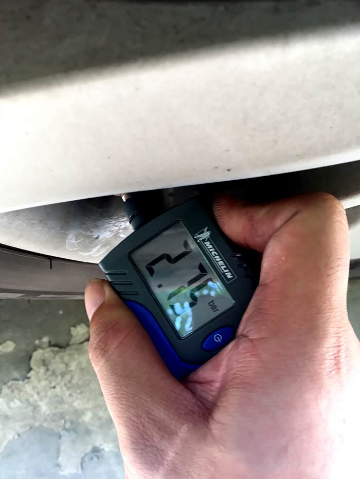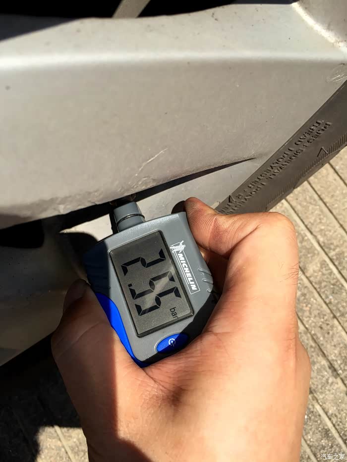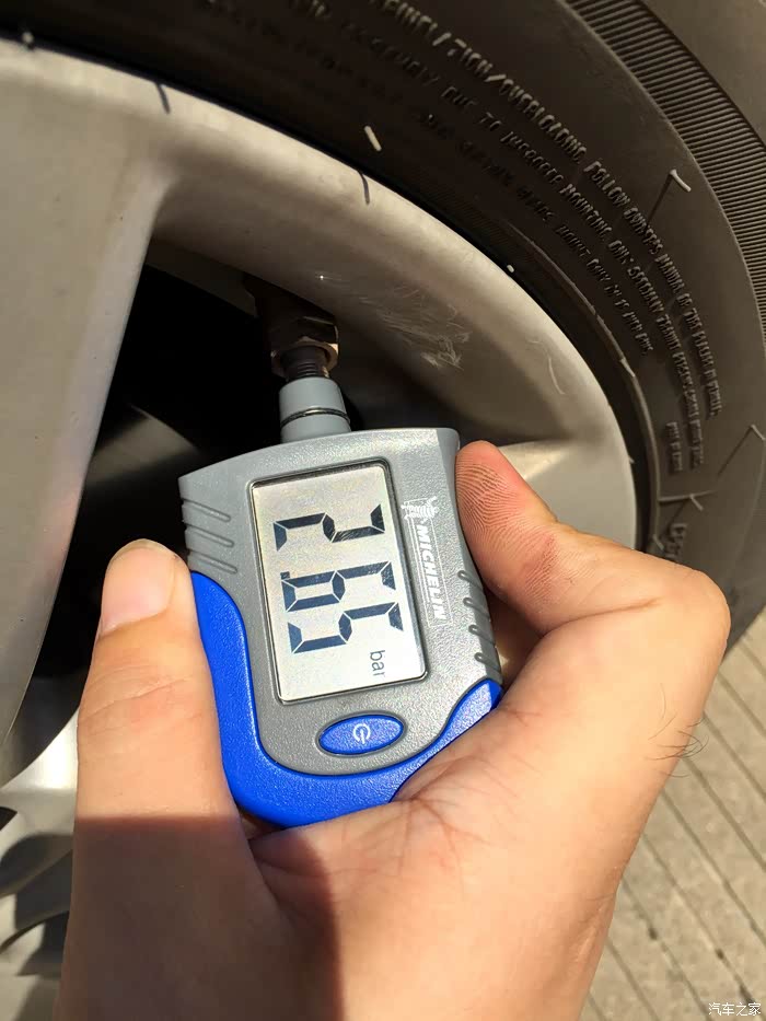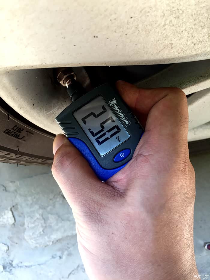 自备一个米其林胎压计,间隔几个月会自己量一下胎压。冷车冬季保持2.5,夏季保持2.3,这个数值理论上比较省油。这是热车状态下右后胎压。