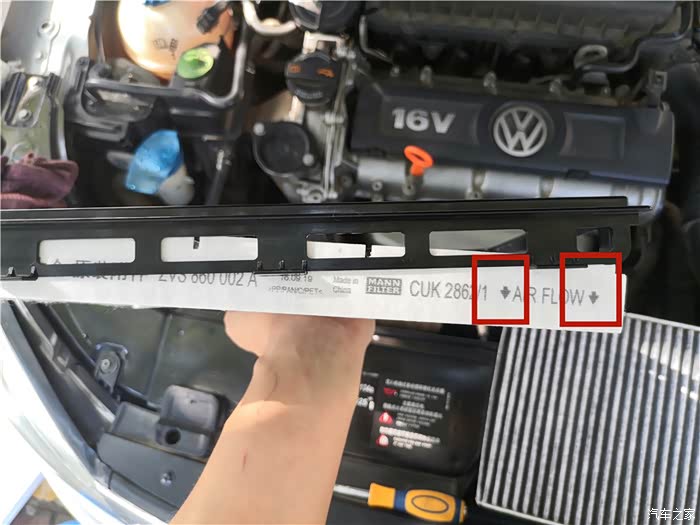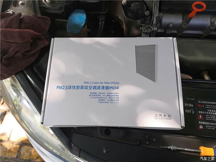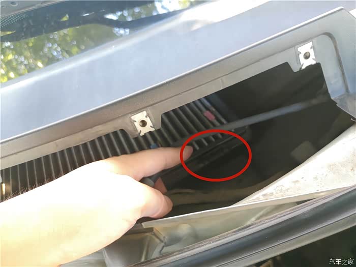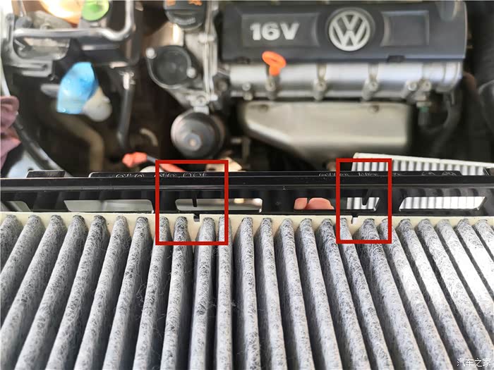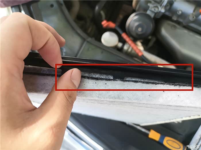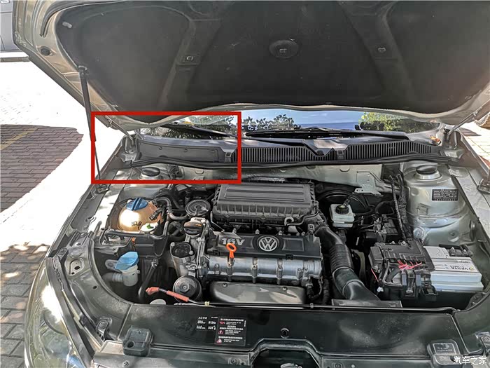 打开发动机舱,准备要更换的空调滤位于副驾驶前面,也就是发动机仓左侧。