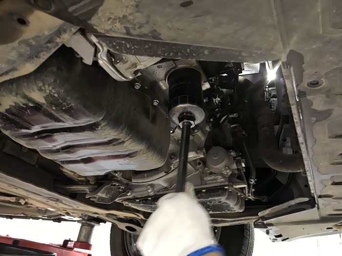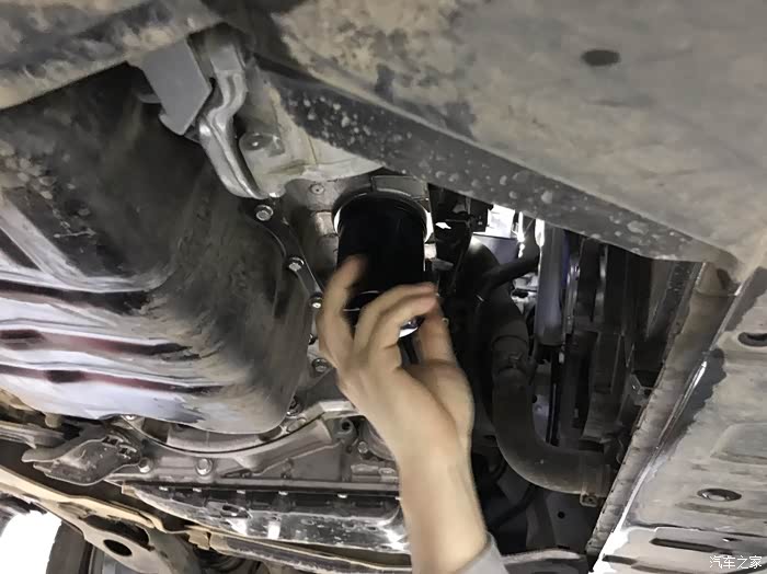 旧的机油滤芯已取下,开始装新的。
