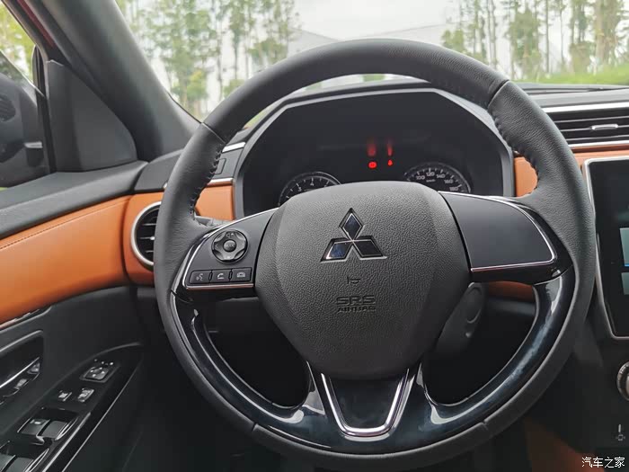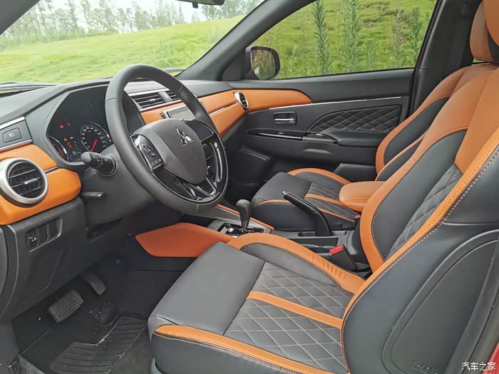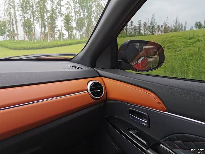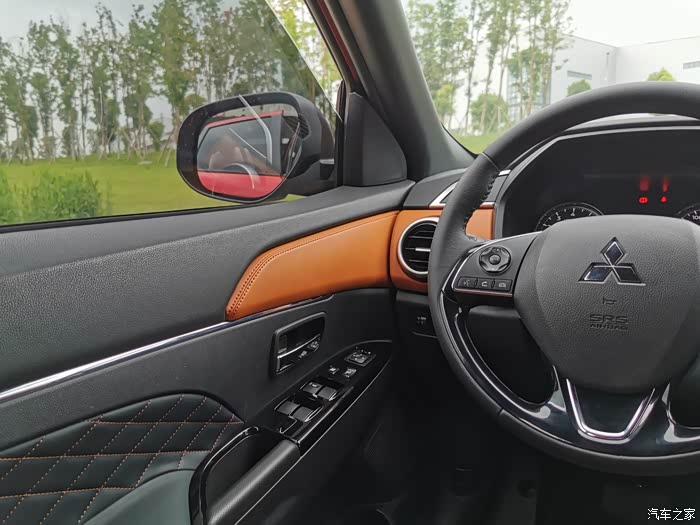 透过后视镜能看清楚车后的大致车况。橙黑相间的内饰显得有层次感,不像老款的来的那么的单一。