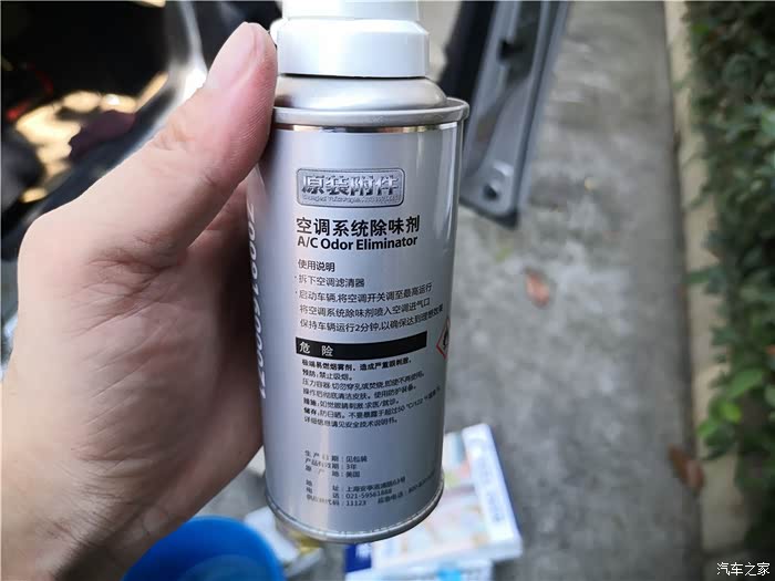 还剩一瓶小瓶的除味剂,看下说明:从进风口喷入,然后使其通过整个空调系统。