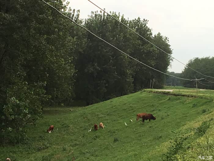 故乡江堤上自由自在吃草的牛群,小时候我也是放牛长大的。