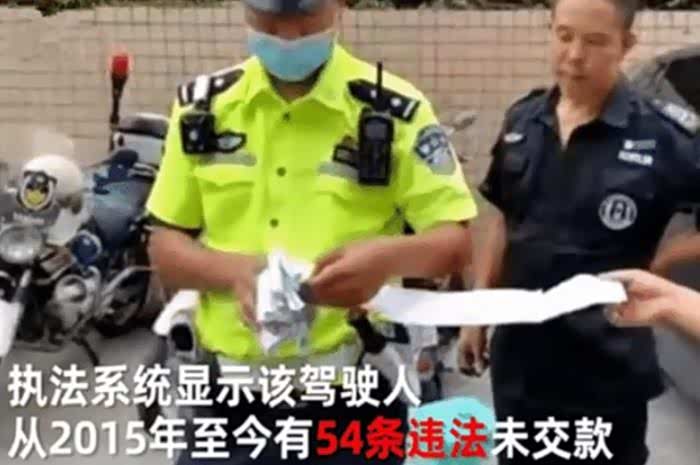 然而更让人惊讶的事情还在后面,交警同志通过车牌查询之后发现这台车子从2015年到现在足足有着54条违章罚款没有交纳,而交警同志打印出的罚单足足长达了3.6米,这样的处罚规模也着实是让人惊掉了下巴,而这些违章刨除滞纳金后的罚款金额仍旧高达了1500元。
