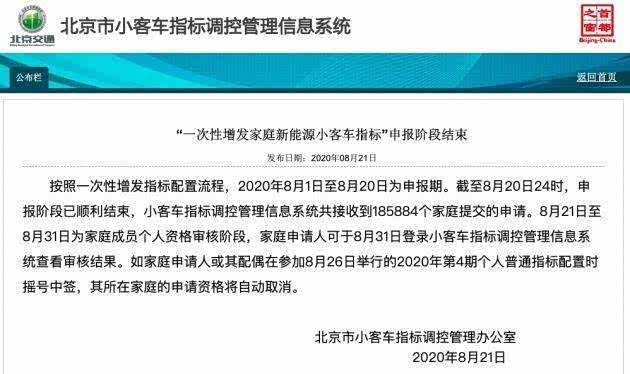 北京市小客车指标管理信息系统网站21日发布消息称,按照一次性增发指标配置流程,2020年8月1日至8月20日为申报期。截至8月20日24时,申报阶段已顺利结束,小客车指标调控管理信息系统共接收到185884个家庭提交的申请。