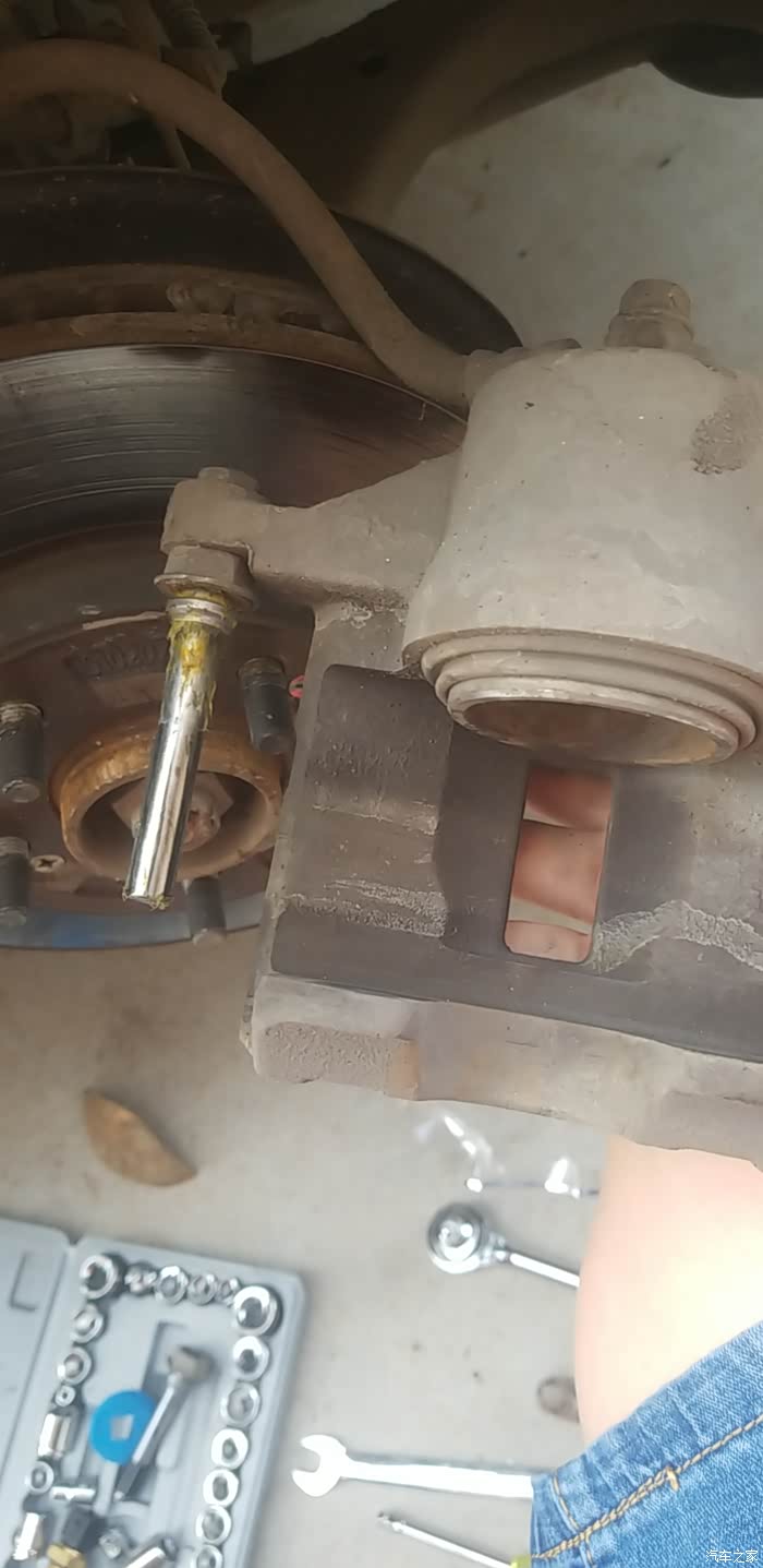 逸动前刹车很简单,拆一颗螺丝就能把导向销和刹车片拿来下。18w公里没弄过,活动还是挺好,拆下来没生锈,这玩意看来没必要经常保养吧。