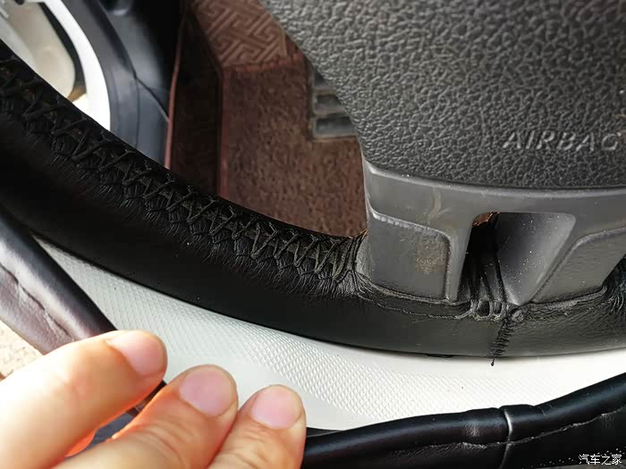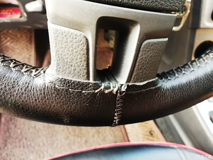 手缝真皮方向盘套下部的接口,缝制的非常牢固。接口上部有了磨损的痕迹。