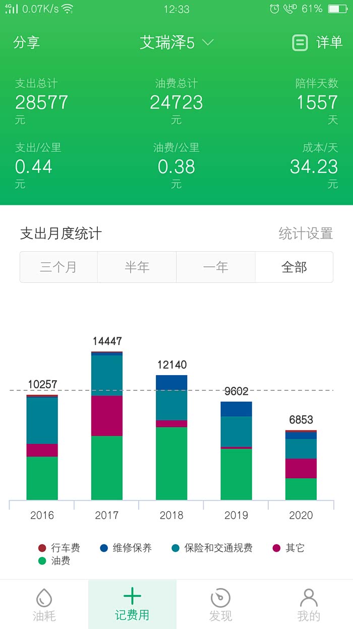 53300元具体总体花费分别包括油费支出总计24723元,保险维保维修改装等支出28577元(其中保险支出16092.91元,改装7913.09元,保养维修4081元,行车费过路费490元).平时高速比较少,大部分为城市路况+国道路况。