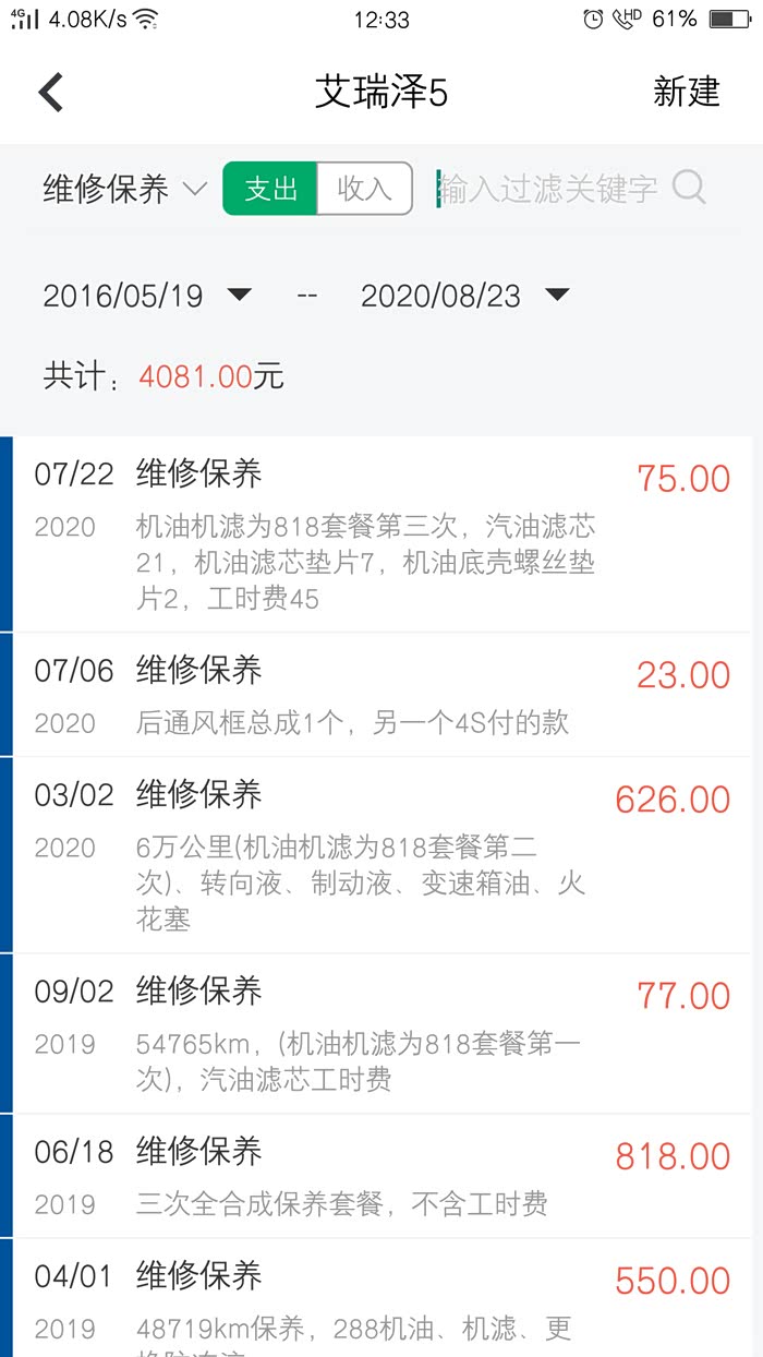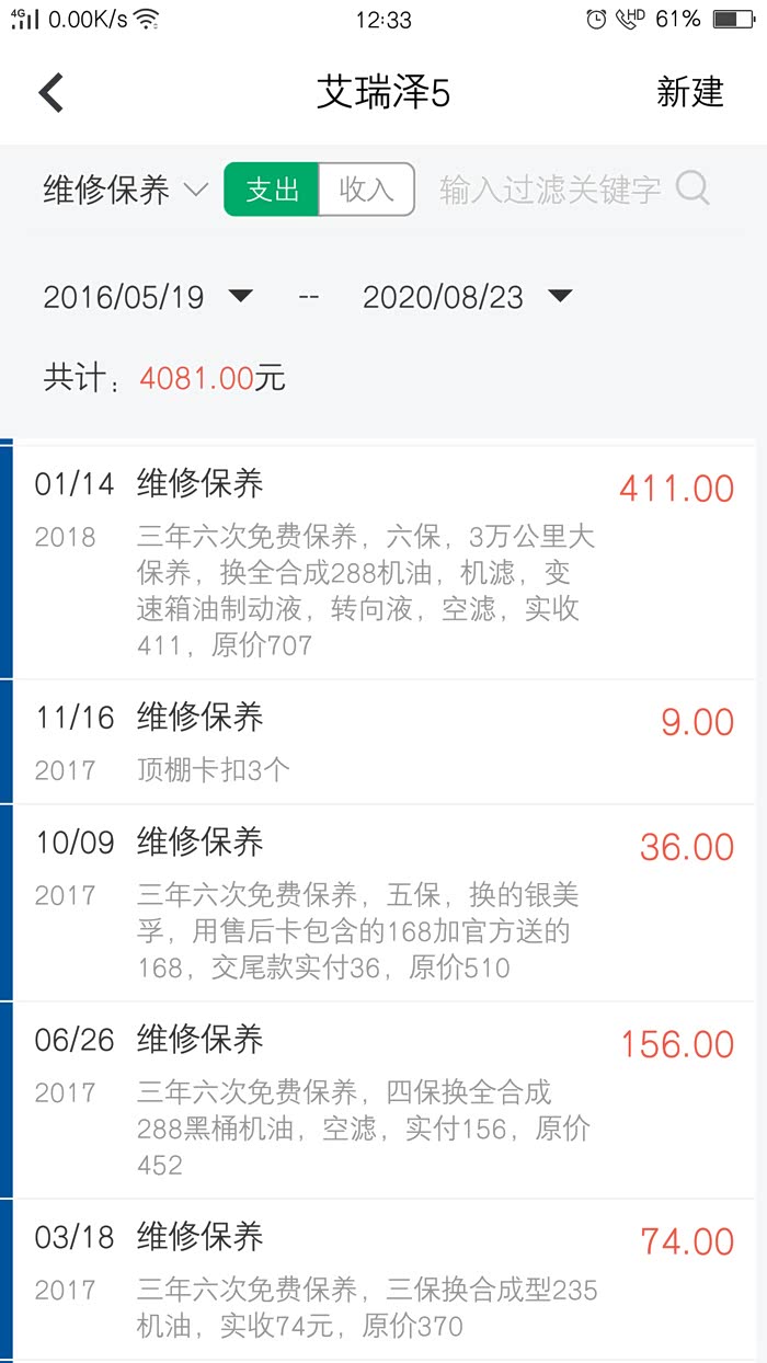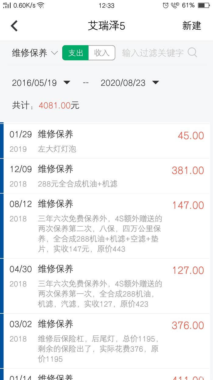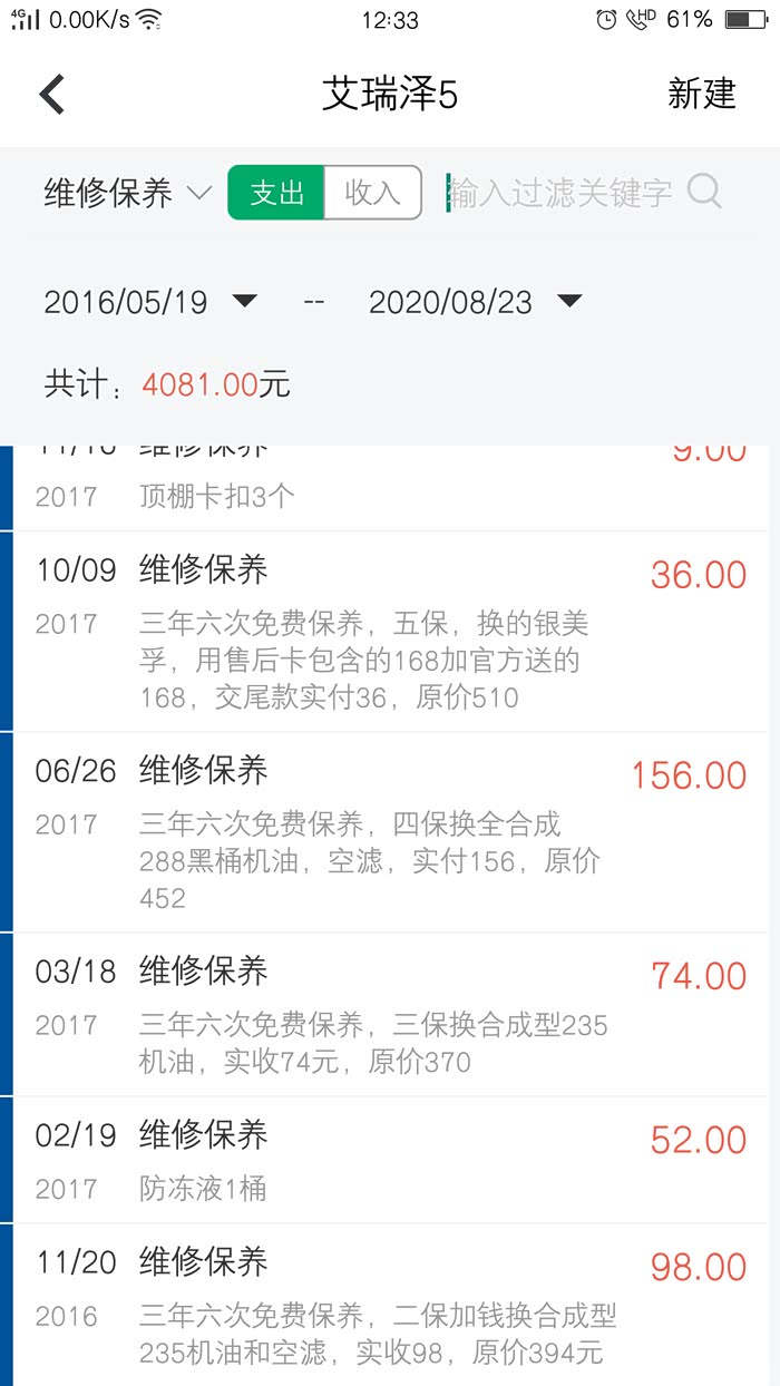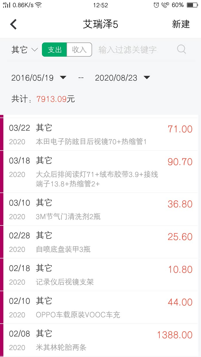 艾瑞泽5是我第一辆车,毕业以后那几年想赚钱买房就去学挖掘机,所以前几年工作一直在西部地区从事西气东输工程的挖沟、埋管等工作,也不常回来所以不需要车,后来谈了对象打算回来结婚,于是买车就提上日程,为什么当初选择这款车呢,因为刚买了房,还要留钱装修,当时手里没闲钱,其次也正好是我们这里车展,可能机缘巧合吧,觉得外形不错,就买了,订的最便宜的这款手动领潮版。从2016到2020,小艾也进入第5个年头了,6.5w公里全程4S保养,可以说任劳任怨,为我遮风挡雨,从没把我扔在路上,中间也出现过小插曲,被人追尾对方全责,后来修好了,正常损坏的就坏过一个左边的灯泡。结婚后因为和老婆上班不同方向,就又买了一台途胜,为啥是现代不是奇瑞因为她喜欢嘛,哈哈~言归正传,本人旨在分享个人用车油耗统计及总体花费,有的人肯定要吐槽啦什么无聊呀之类的,还有人威胁俺不让俺发俺的真实情况,俺不怕,现在的人说句实话真难呀,动不动就被攻击污蔑威胁。好在俺从工作起滴账目就十分清楚,因为俺基本不用现金,即便随礼也会记下来,不喜勿喷。