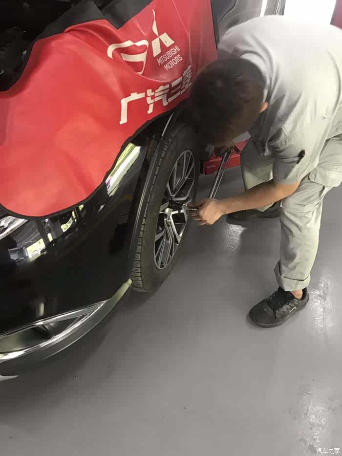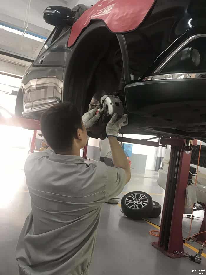 师傅检查完轮胎现在开始检查刹车片