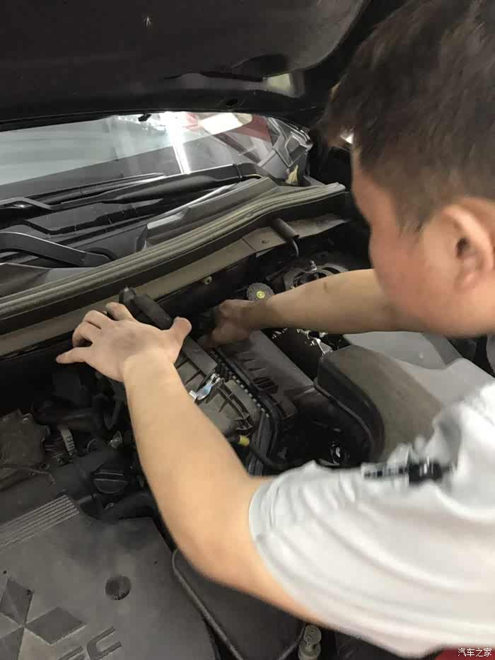 接下来小哥给我更换空气滤芯,这玩意原来这么简单只要打开扣子,取出原来的空气滤芯在加上新的就可以了,真的好简单啊