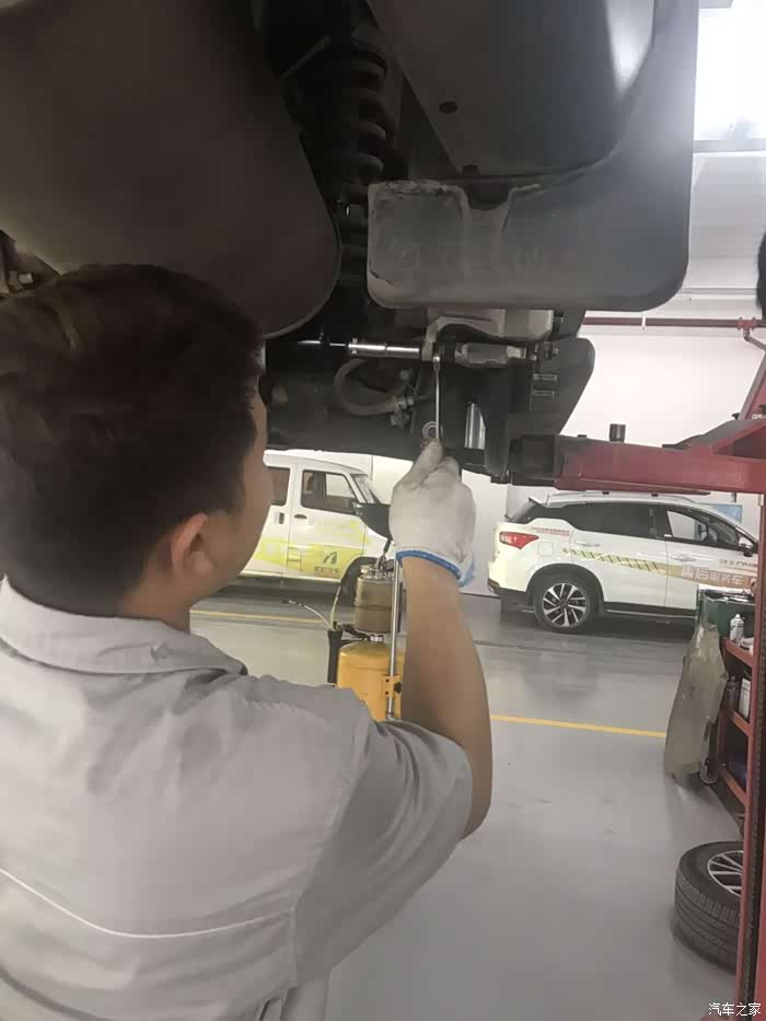 到了4S店里了,先把我的小欧架起来,让师傅们好好检查检查,师傅上来就把我的轮胎拆了,今天的保养项目就是检查刹车片和刹车盘,还有就是轮胎的磨损度