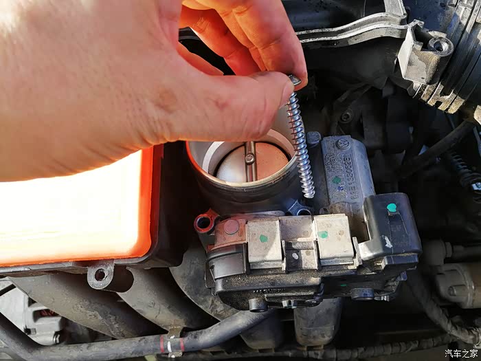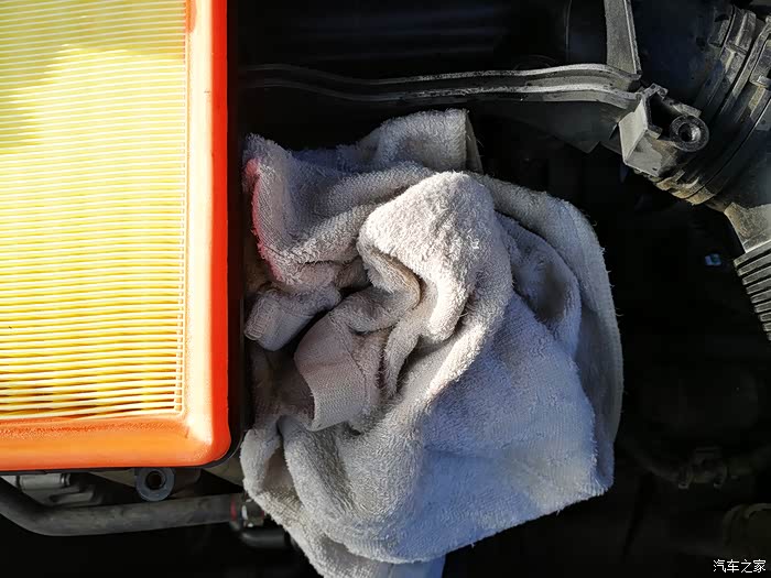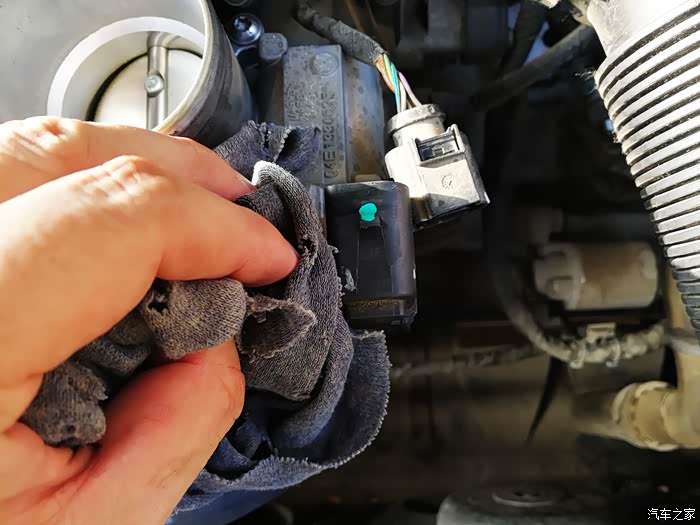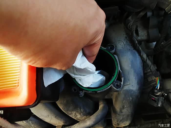 清洗节气门前,拿一块软布把进气歧管挡住,防止灰尘进入。