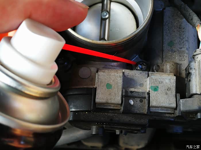 继续用油污清洗剂喷洗。我的节气门比较的脏,喷洗了五、六次才清洗干净的。