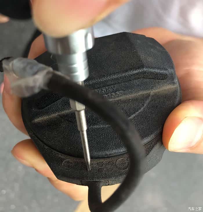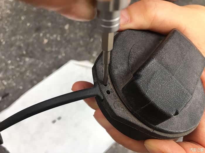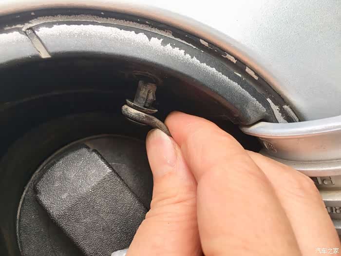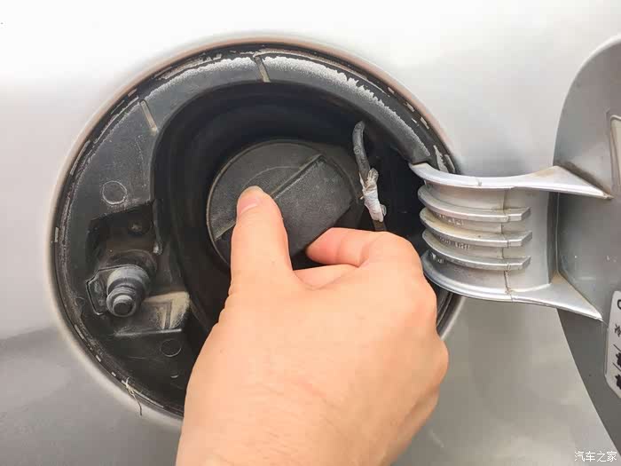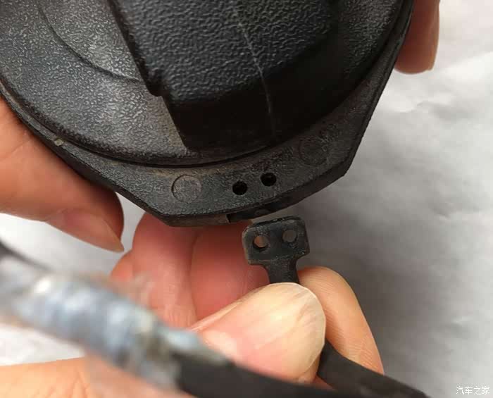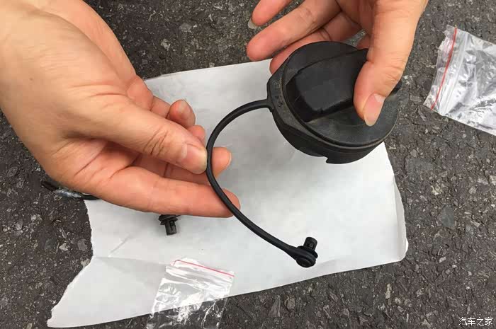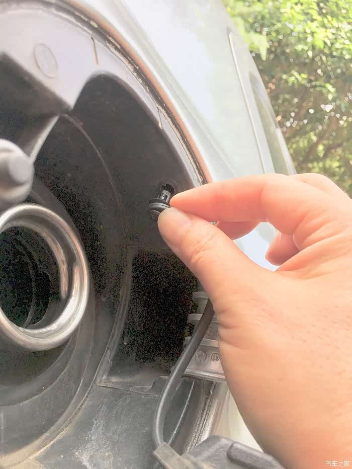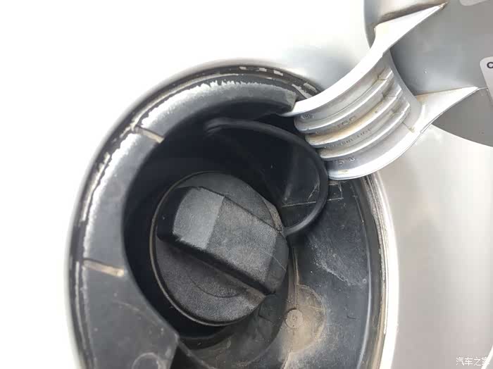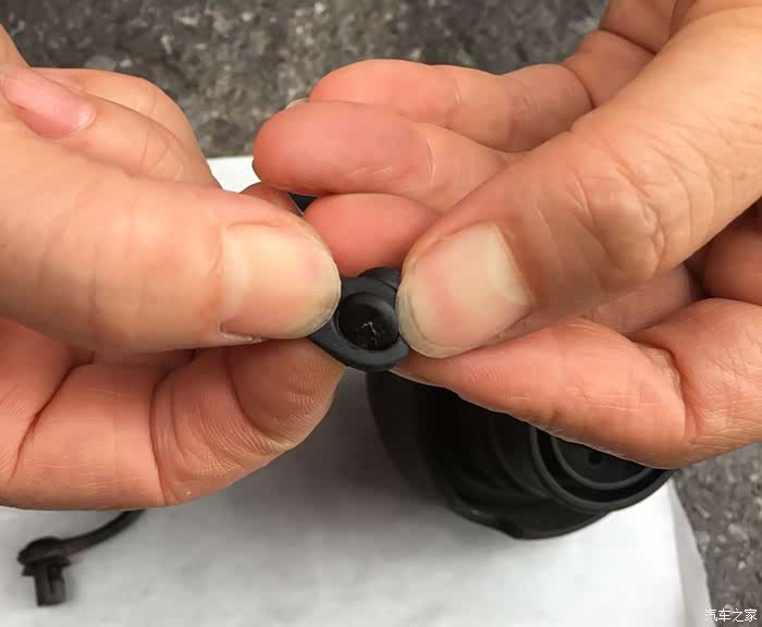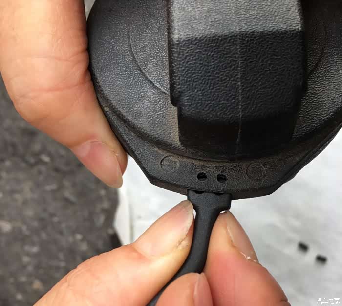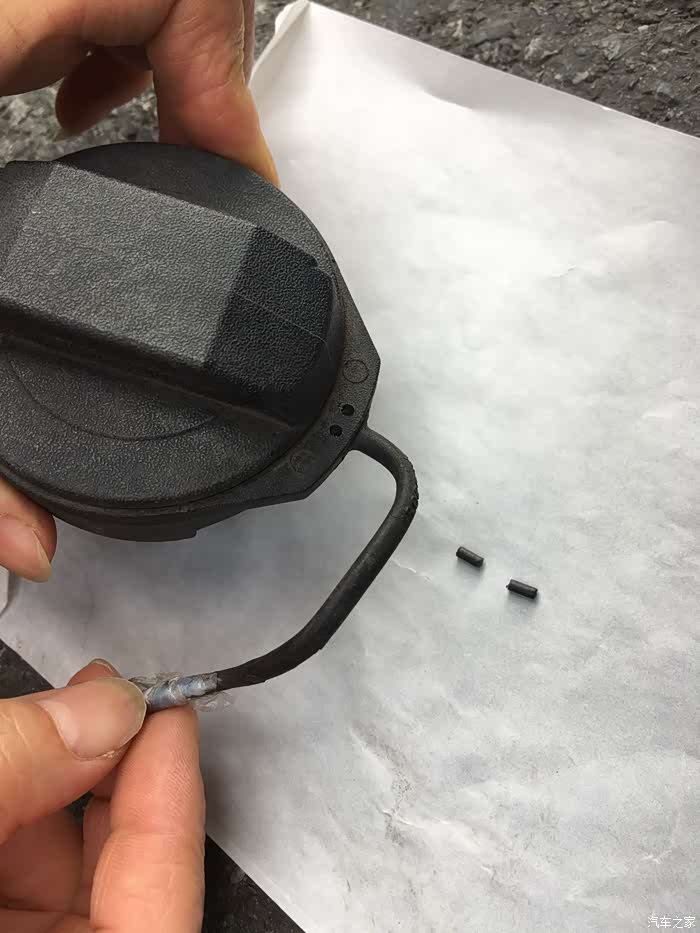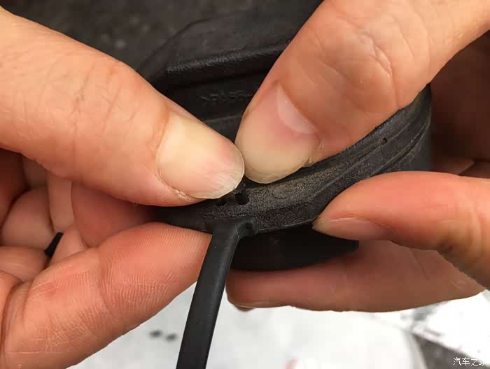 新配件看起来比油箱盖的孔大一点,用手指捏一下,往里塞。