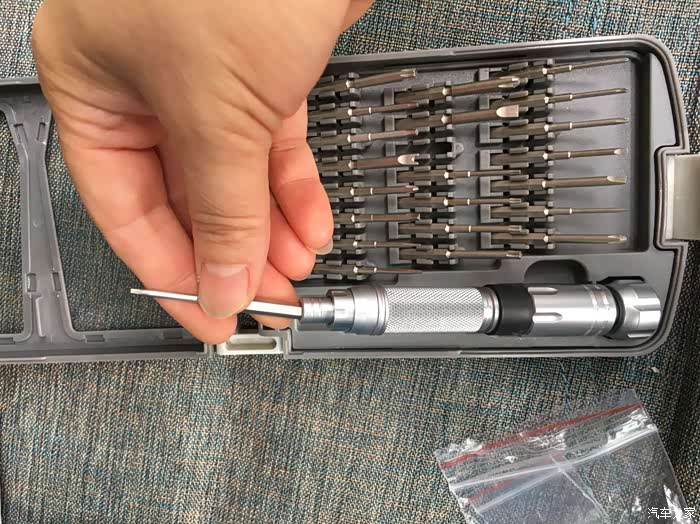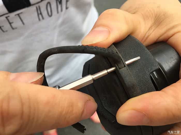 我从工具盒中选了一个很细小的内六角螺丝(其实可以用扳直了的回形针或者圆珠笔芯)将油箱盖卡销顶出来
