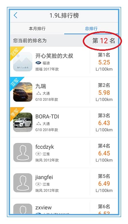 同使用这种软件的用户当中,同是1.9排量柴油车中,我的油耗排名第12位。第二、三、六名也是大通G10。不到6升的油耗确实够