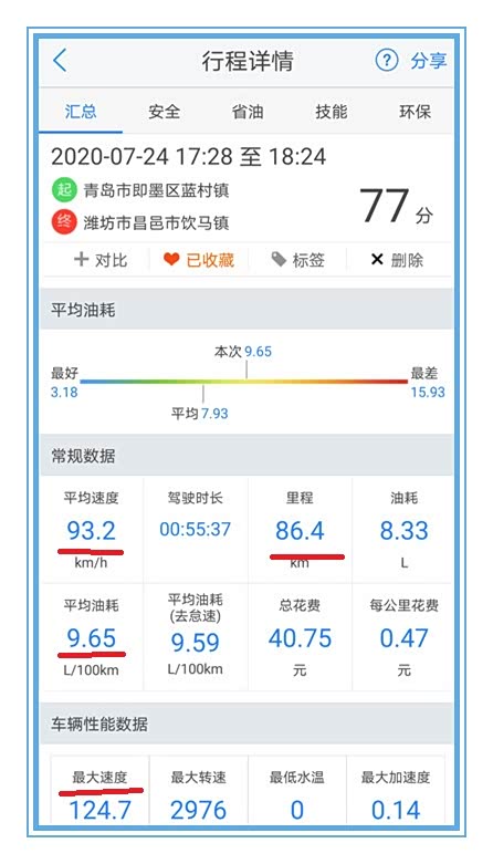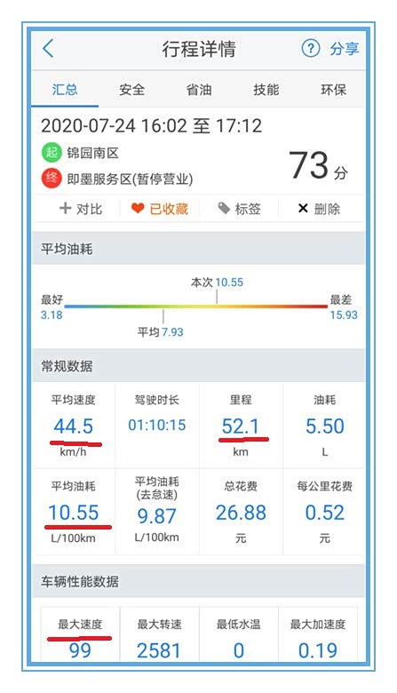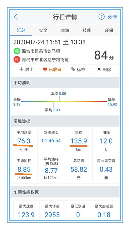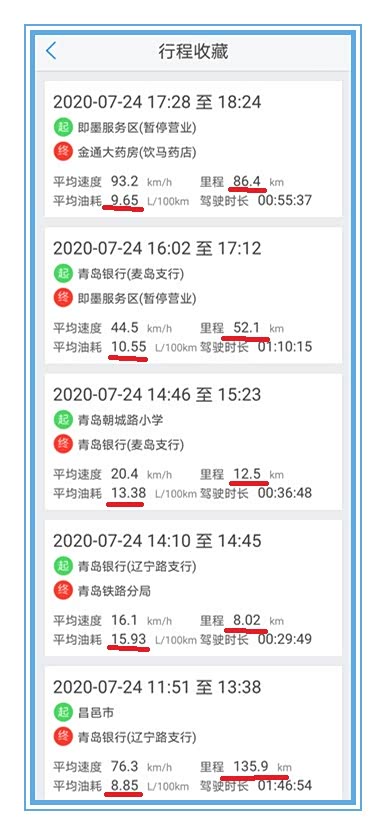 这就是一天下来,所有路段所用的油耗与行驶数据