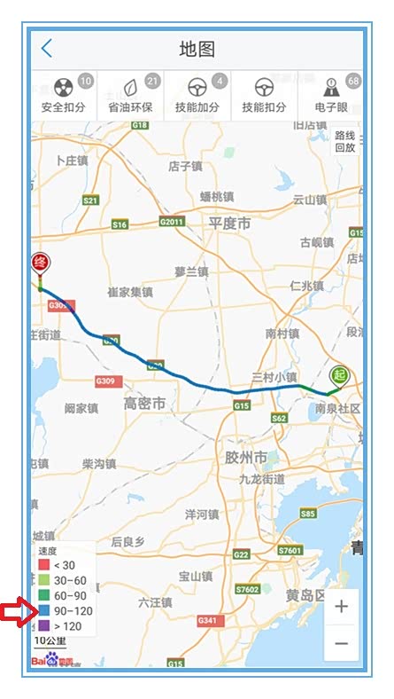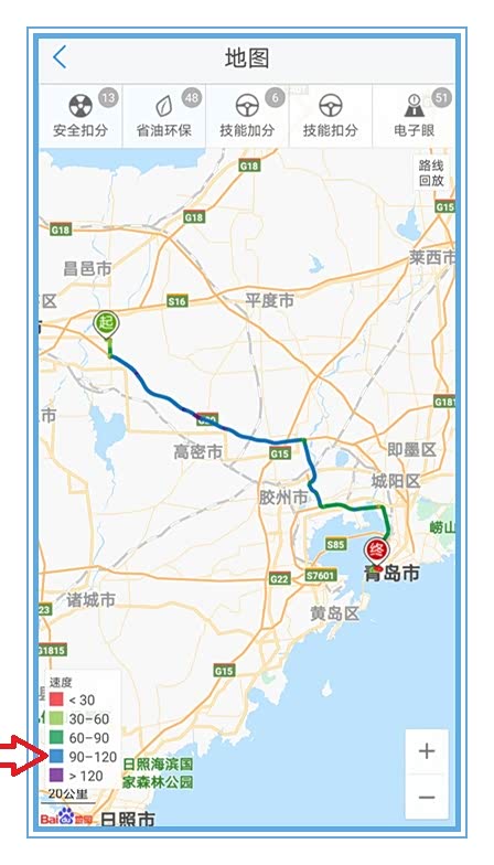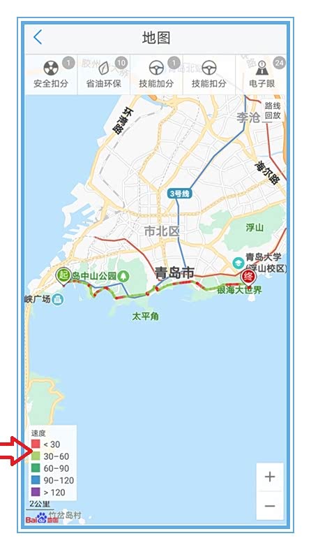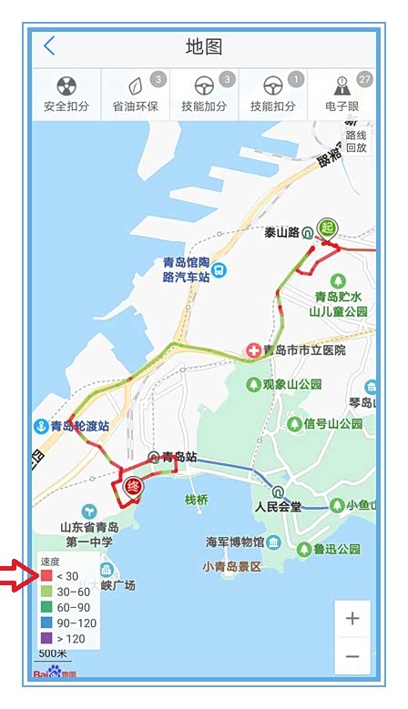 于是我找出了行车轨迹查看地图,行车轨迹显示的红色路线,都是拥堵路段,时速低于每小时30公里,也包括路口红灯等待。有这么高的油耗也就不奇怪了。但是油耗这东西,短距离测试并不能代表平均油耗,任何车刚起步加油门,喷油量都会很大,距离短频繁起起停停自然费油啦。