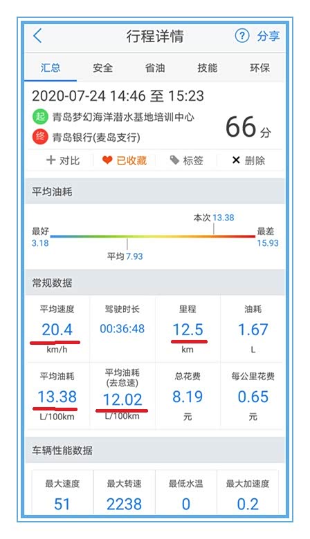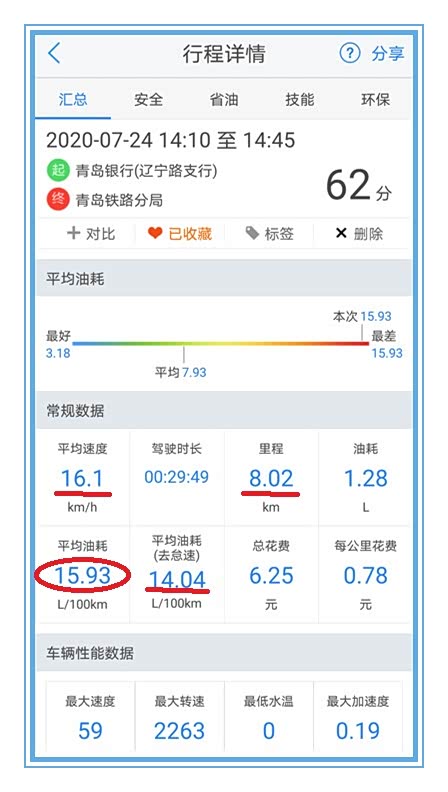 当我第一次看到时我也不敢相信,我终于知道别人是怎么开出那么高的油耗来的了。先别急着下结论,往下看!总里程才8公里,行驶速度才每小时16公里,总用时长接近30分钟。怠速油耗同平均油耗相差1升油,说明怠速时间很长。行车时间在下午两三点钟最热的时候,一家五口在车上空调是不可能关的。