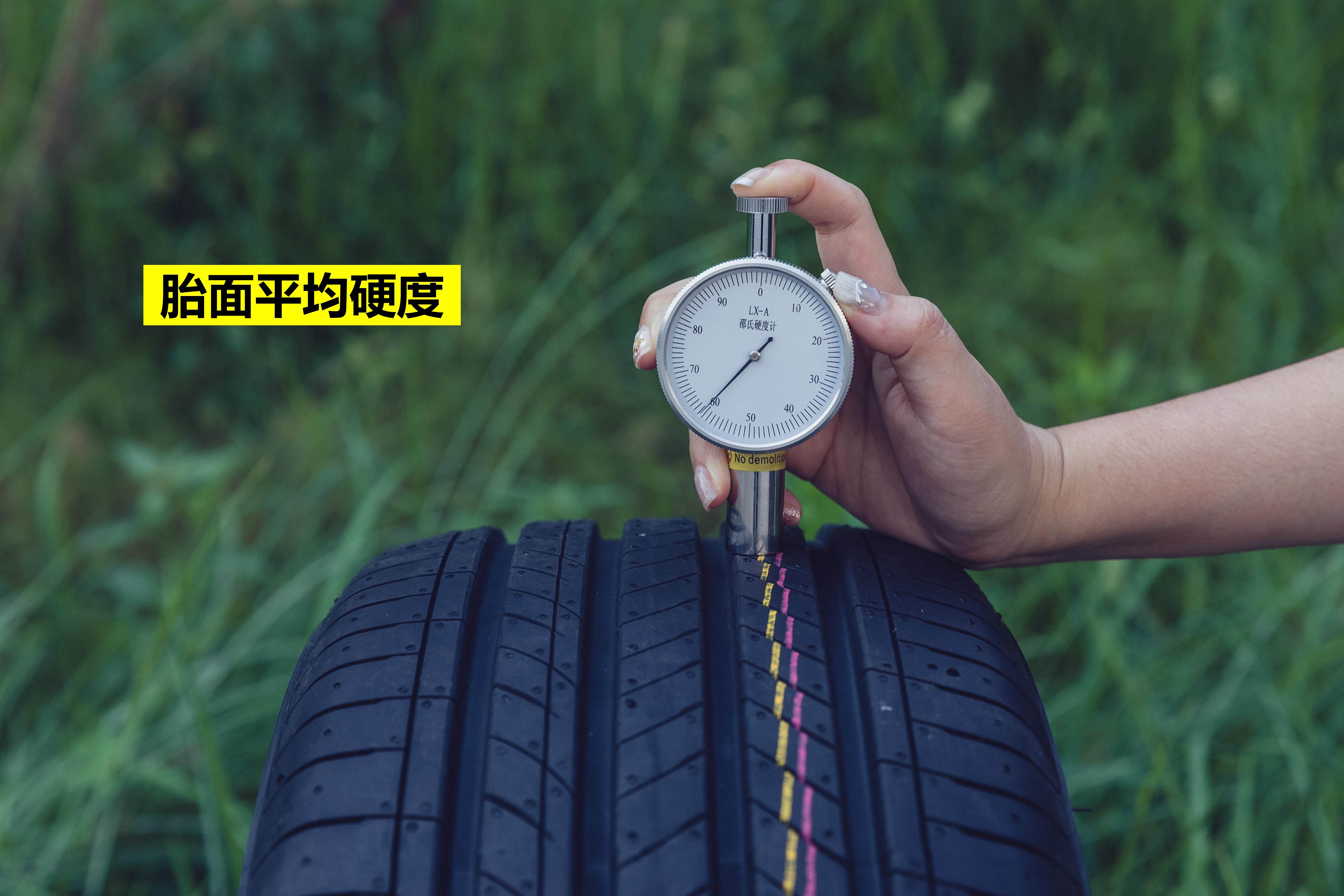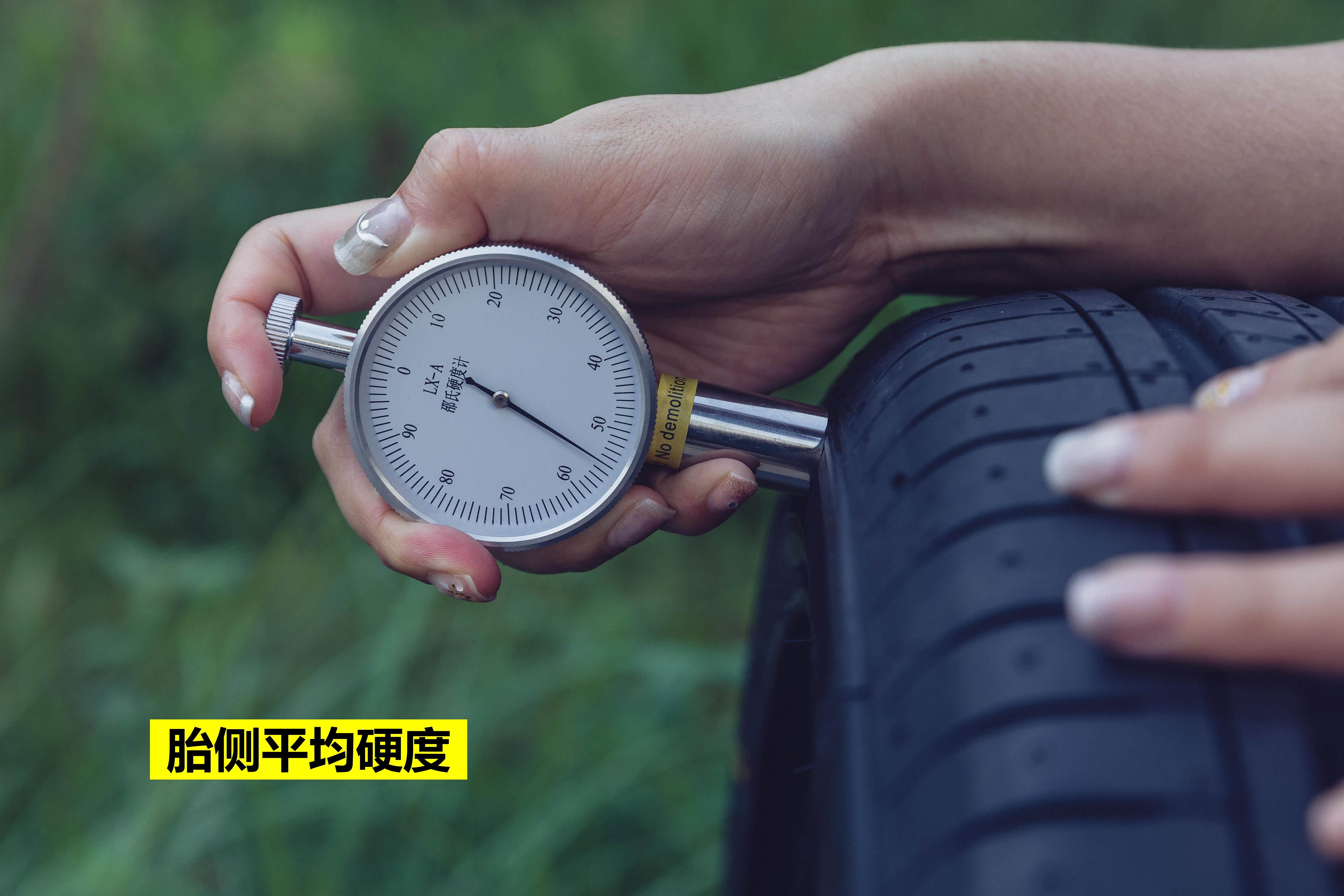 使用强度仪测试轮胎硬度,韩泰H462面平均硬度为:60.8HA,胎侧平均硬度为55HA,这个硬度表现好处是有利于支撑性及操控性的表现。
