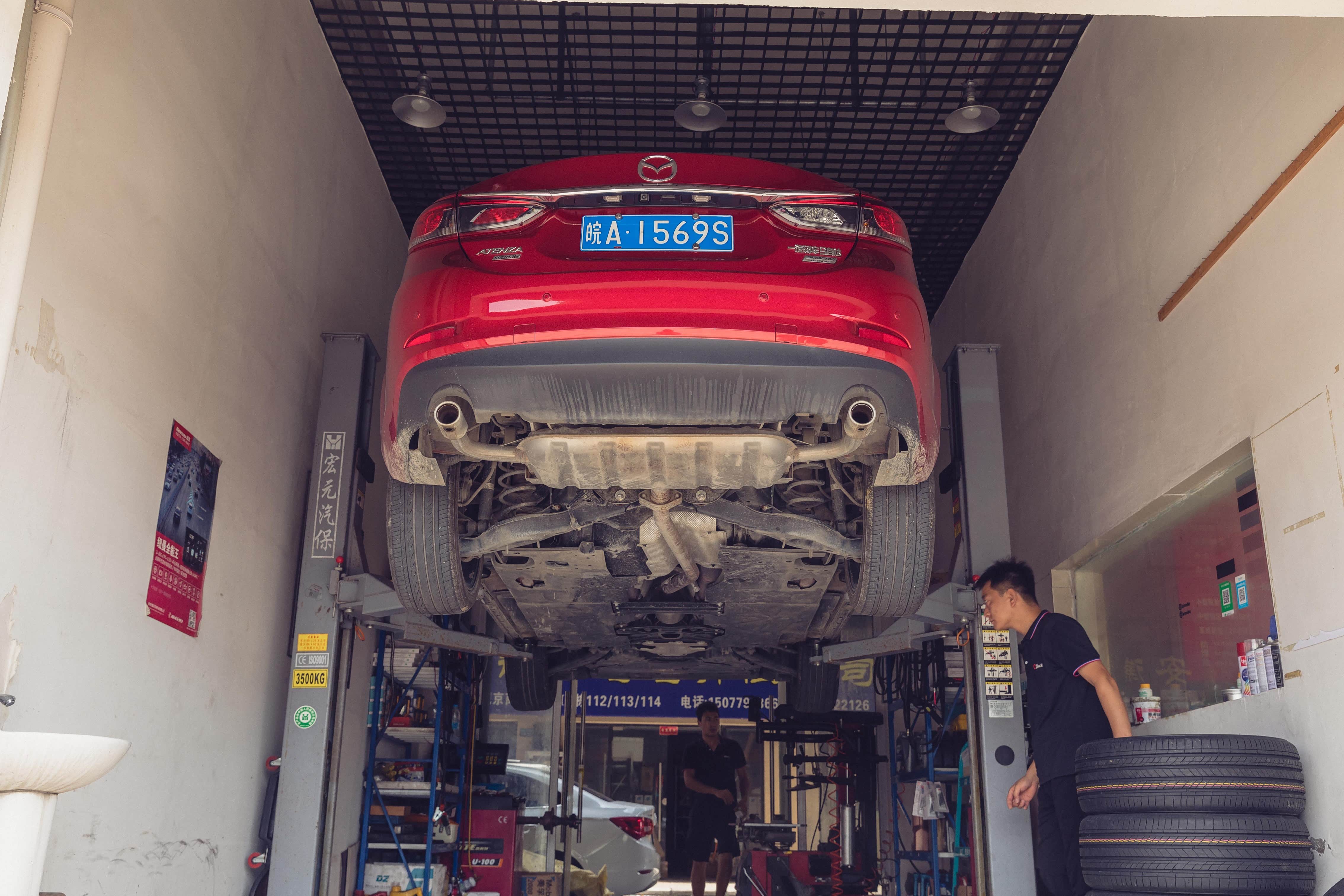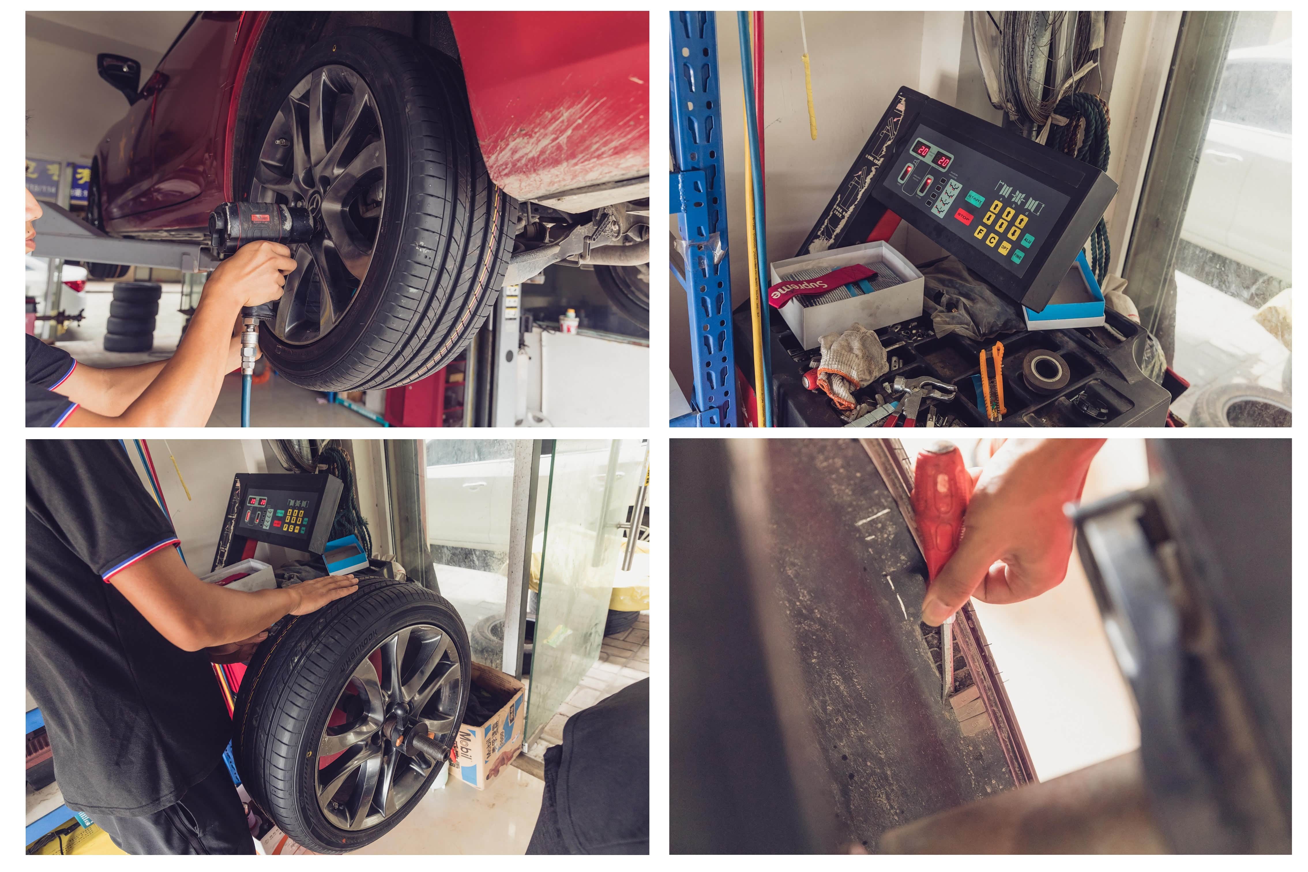 找到换轮胎的店,车子上了龙门架,就准备换新胎咯。