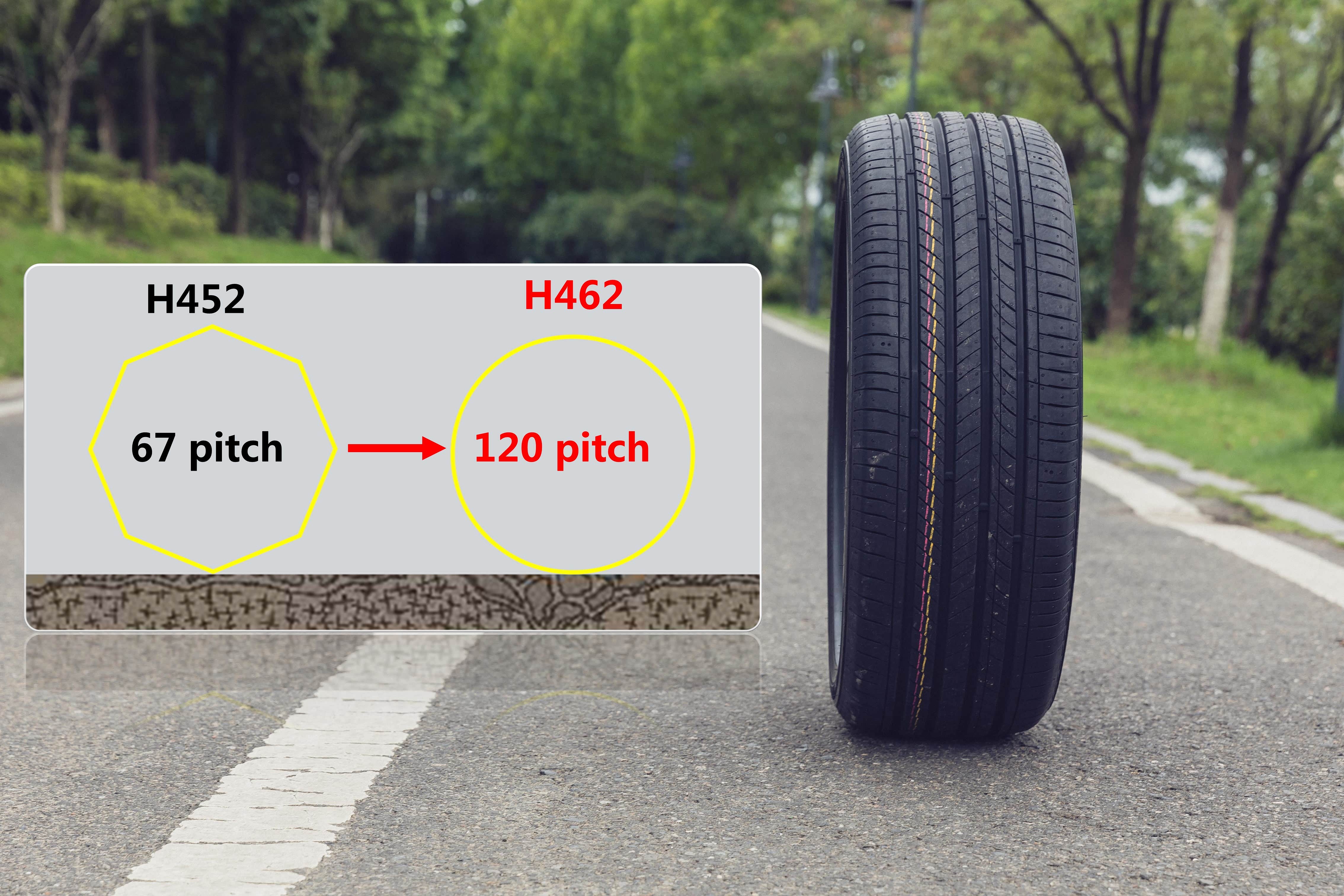 轮胎表面有四条宽大的纵向排水沟槽,提供了快速排水功能,提供了良好的湿滑路面性能。韩泰H462轮胎使用的非对称非单导向花纹设计,胎面有内外侧区别。