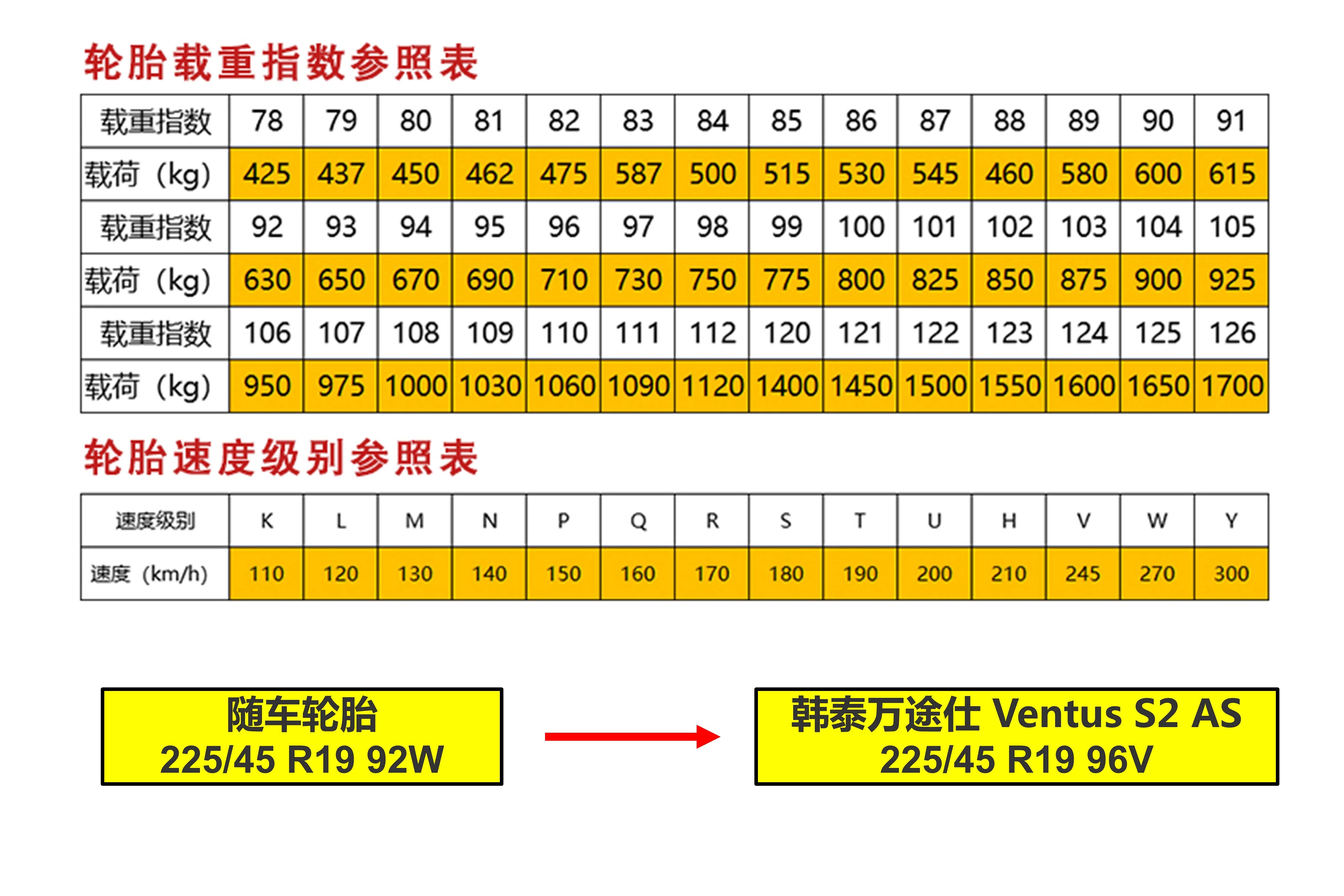 通过数据可以看到,我们的韩泰的H462无论是在载重指数还是在速度级别上都优于随车轮胎的。
