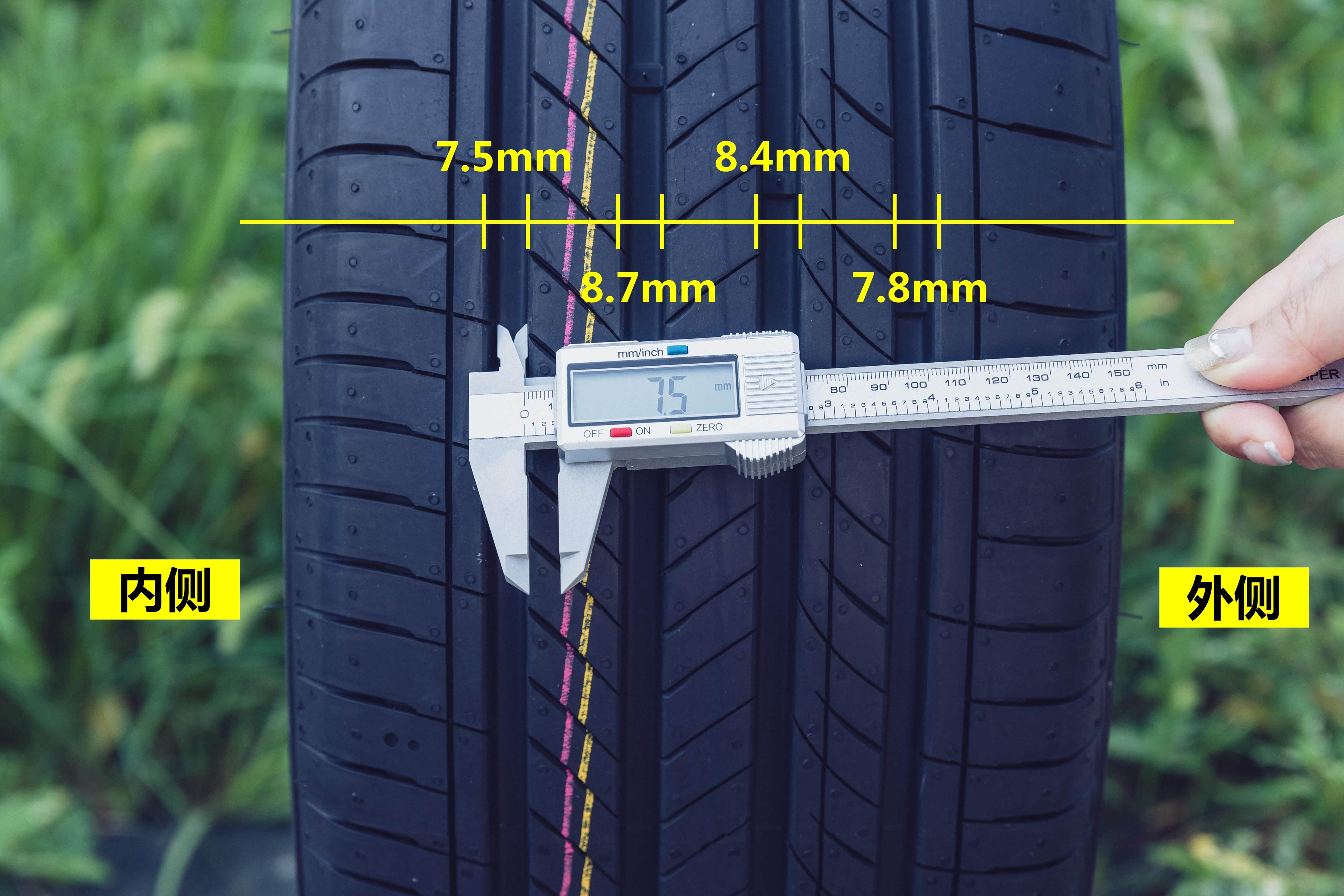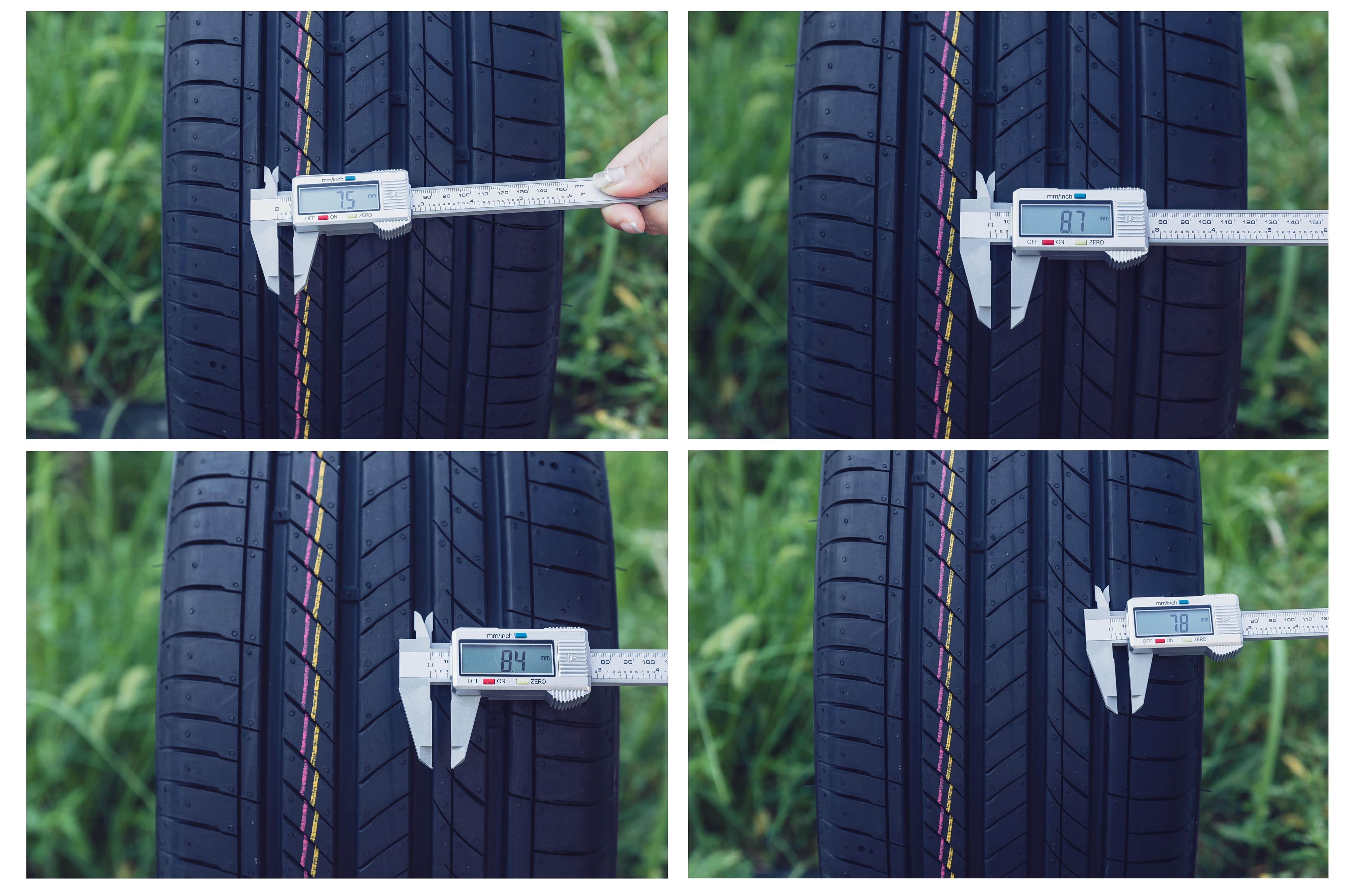 韩泰H462轮胎拥有4条纵向沟槽,从左到右实测宽度为:7.50mm\8.70mm\8.40mm\7.80mm