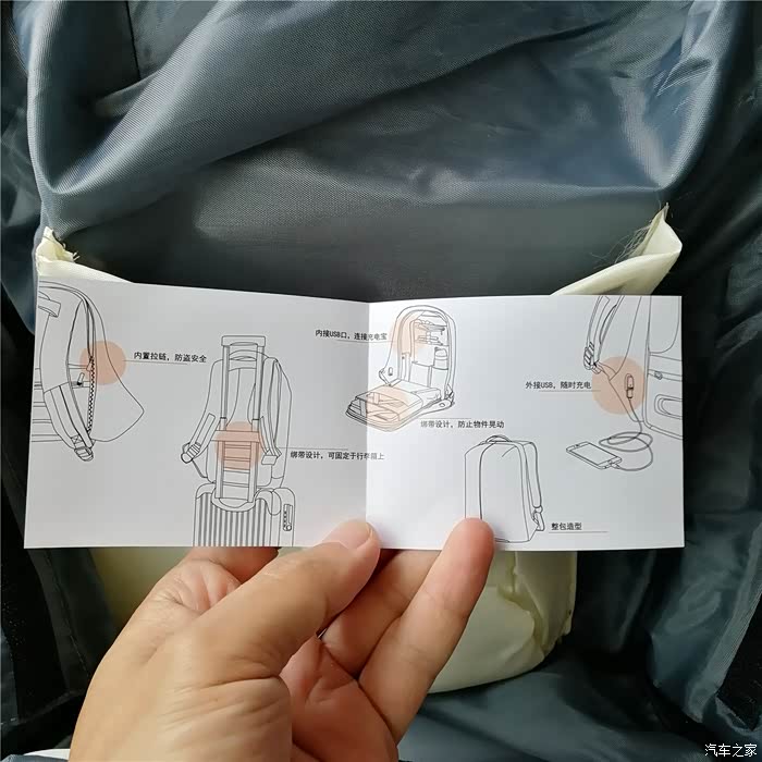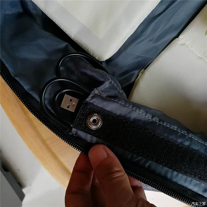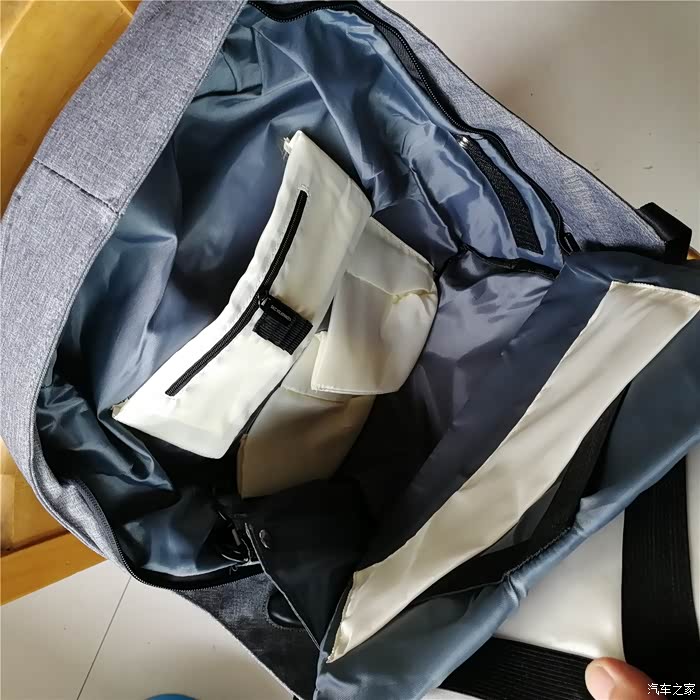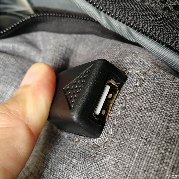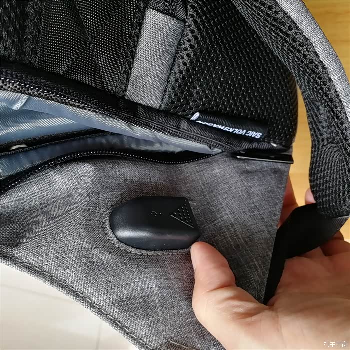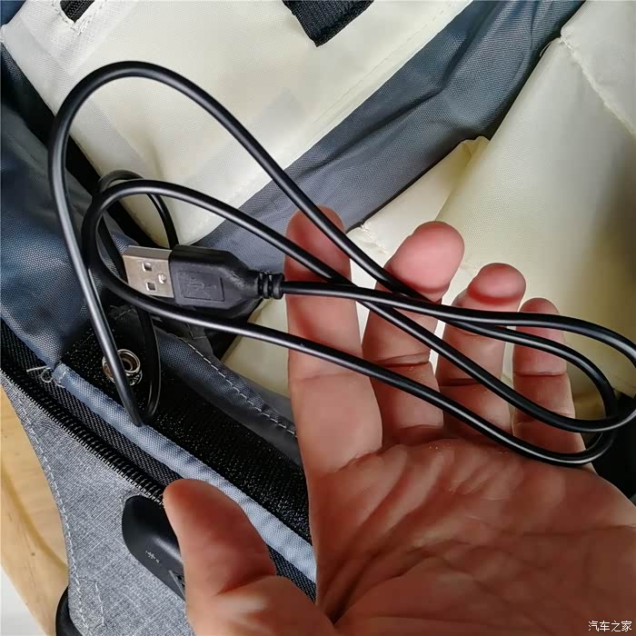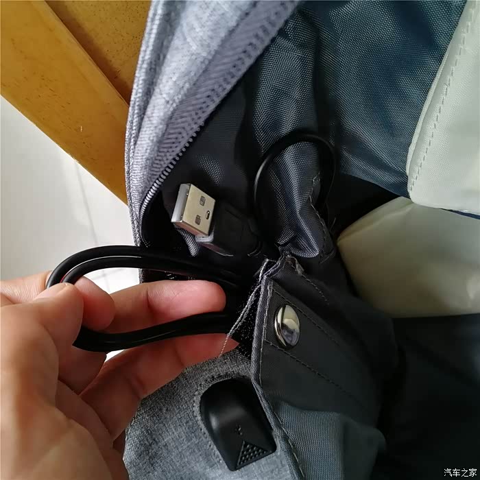背包的开口还是挺大的,将拉链拉到底,会发现一个USB借口,里面带一根充电线,充电宝放里面,手机可以拿在手上充电,感觉很方便哈。