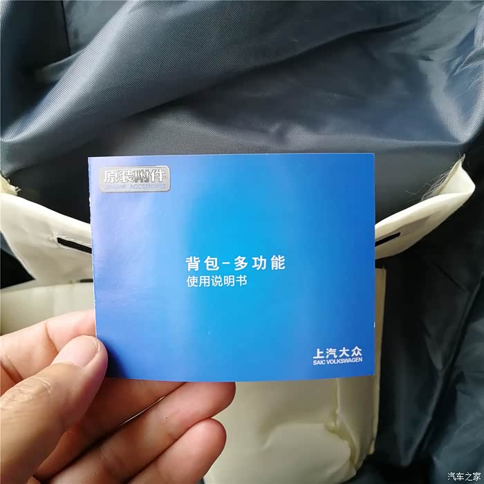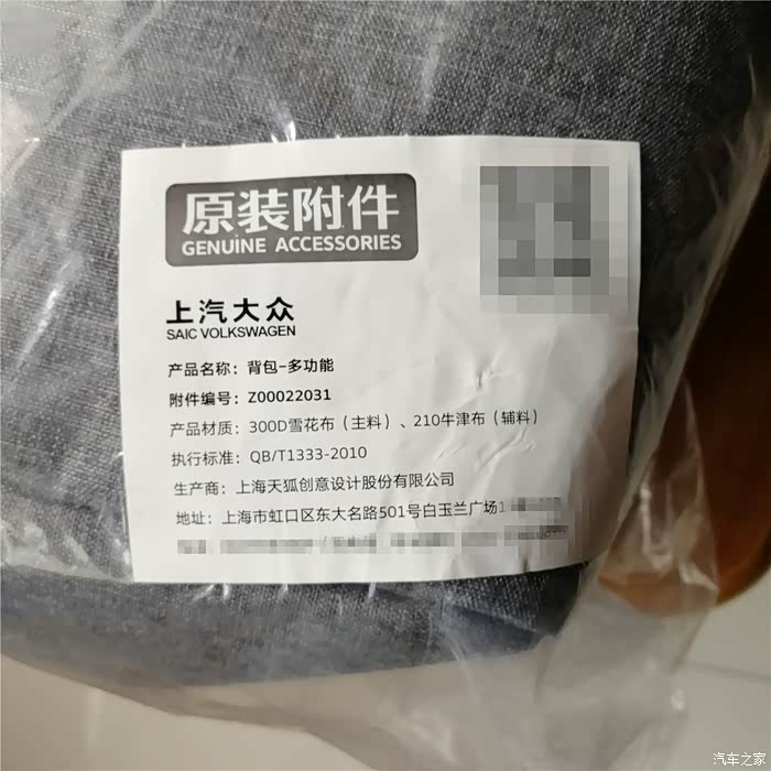 包装袋上的说明书:上汽大众原装附件,材质为300D雪花布、210牛津布。执行标准及生产商。这材料还是很结实耐用的。
