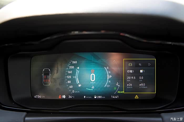 我平时喜欢用领克02的“航行”主题界面。这一界面下,右侧分布着3个模块。记录着一些主要数据,包括行程、油耗,以及PHEV车型特有的纯电行驶时间等等。