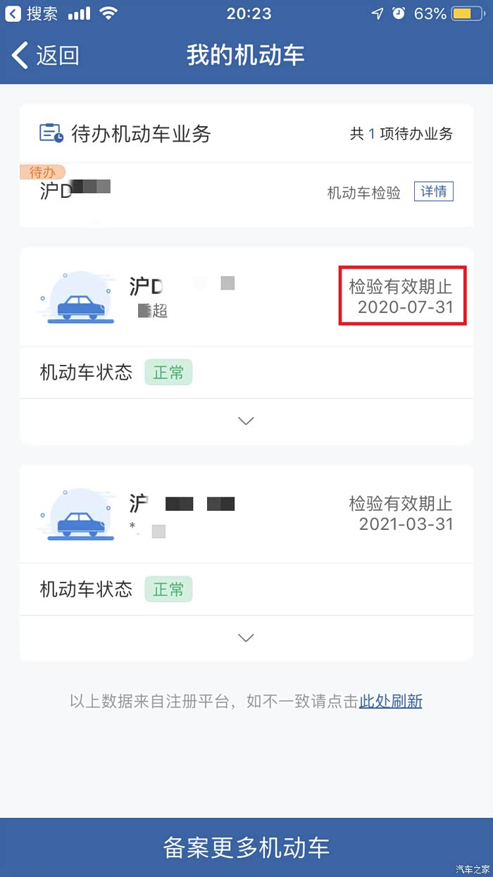 可以看到所备案车辆的检验有效期明细。