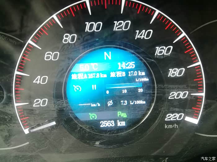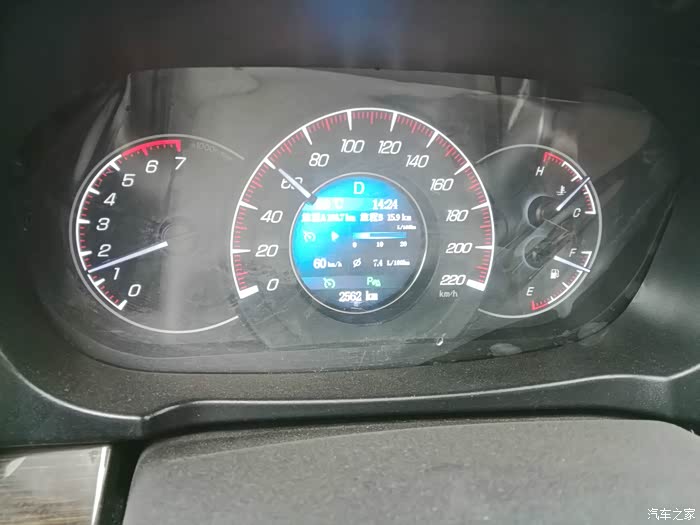 14:24分,出了县城,前方的路况好了,开启定速巡航,设置为60KM,可以看到定速巡航运行的三角号了。此时油耗7.4L。行驶到了2562公里。